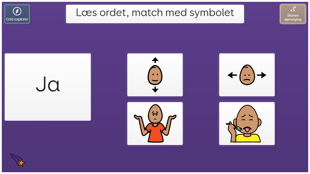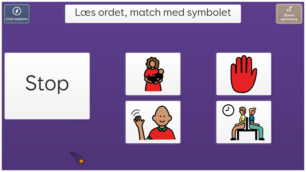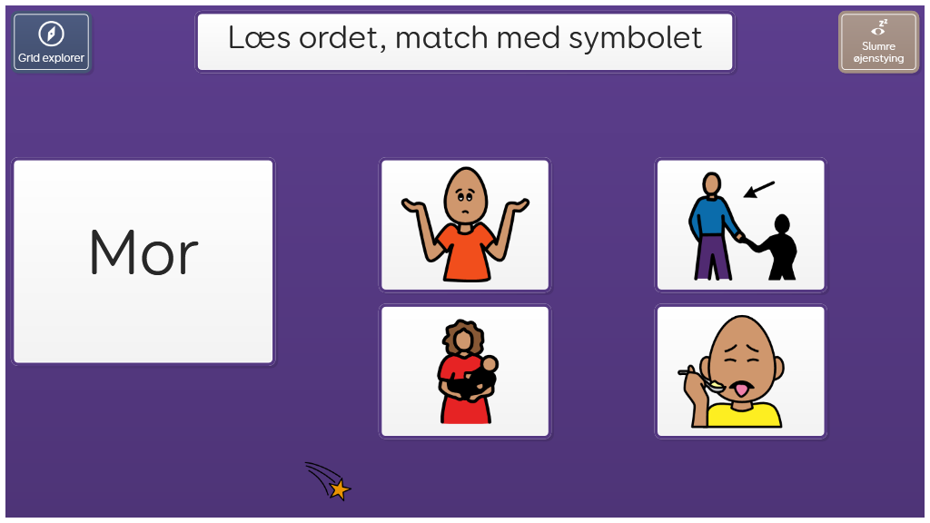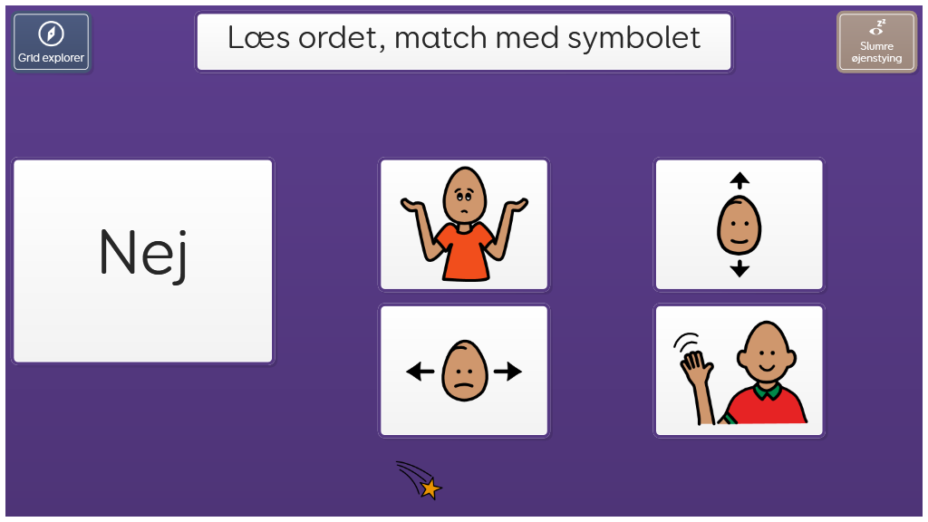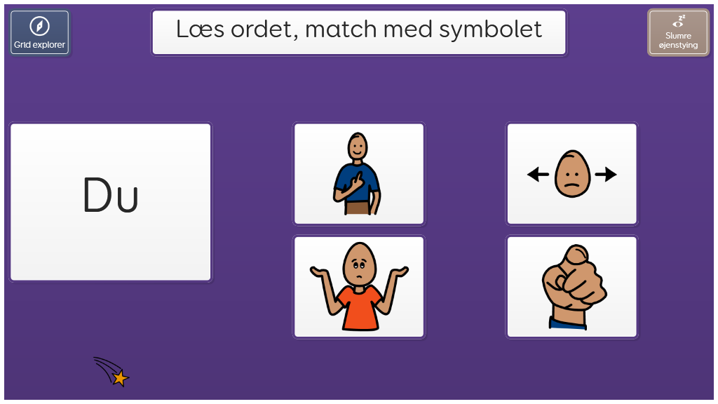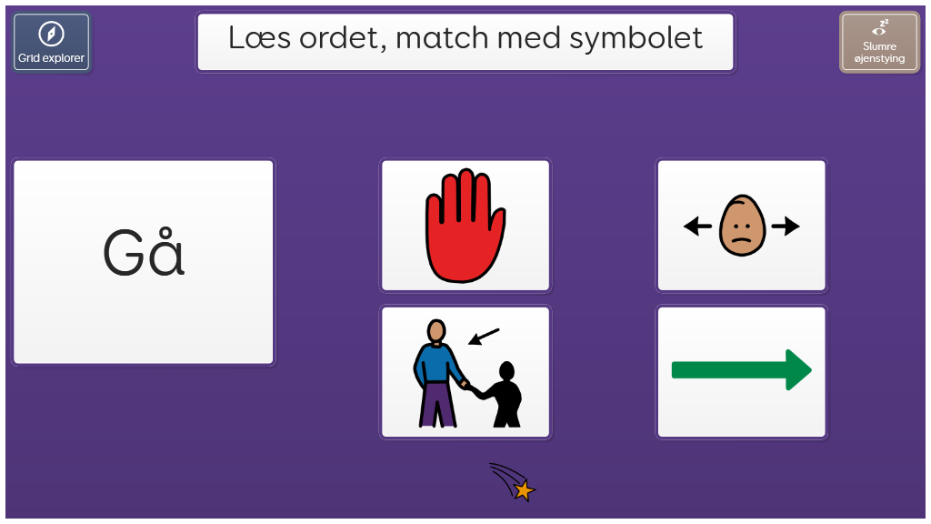 I dette sidesæt skal du se det skrevne ord, og vælge det rette symbol som passer til. Til træning af literacy og "sight words". På dette niveau skal brugeren genkende ordene i sin helhed (læse dem).