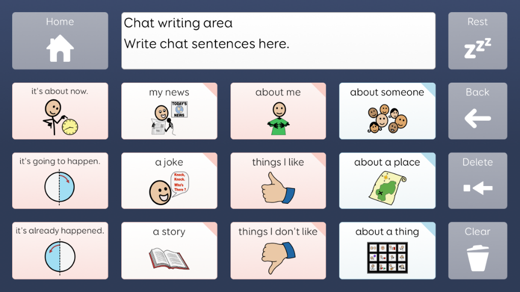 Voco Chat is a low-cell count symbol vocabulary, designed to enable users to communicate for a wide range of reasons. Message pathways, with built-in jumps and carefully selected vocabulary, provide a supported approach to language. The grid set includes resources for supporting communication and emotional wellbeing, with apps such as Symoji and Camera to support interaction and engagement. Voco Chat is suitable for anyone who needs larger cells, and can be used with touch, eye gaze, pointer and switches. Auditory prompts are included for both columns and individual cells. When you add Voco Chat for the first time, you can select either ‘Child’ or ‘Teen and Adult’ in order to choose the most appropriate vocabulary for the user. v1.04