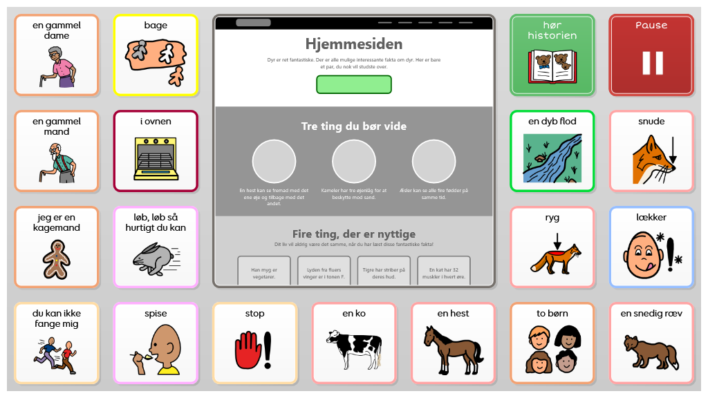 Sidesættet giver dig mulighed for at høre og se eventyret om Honnningkagemanden og ord til at snakke om hvad der sker. Der er en pauseknap, så du kan snakke om eventyret undervejs. Du bestemmer også helt selv hvornår den skal sættes igang igen. Du kan selvfølgelig også snakke imens den kører. Gad vide hvad der sker, når man er en hurtig og lækker honningkagemand? Farvekoden rundt om symbolerne er fra PODD. Denne kan sagtens ændres, hvis dit kommunikationssystem har en anden. Men det har ikke betydning for eventyret.