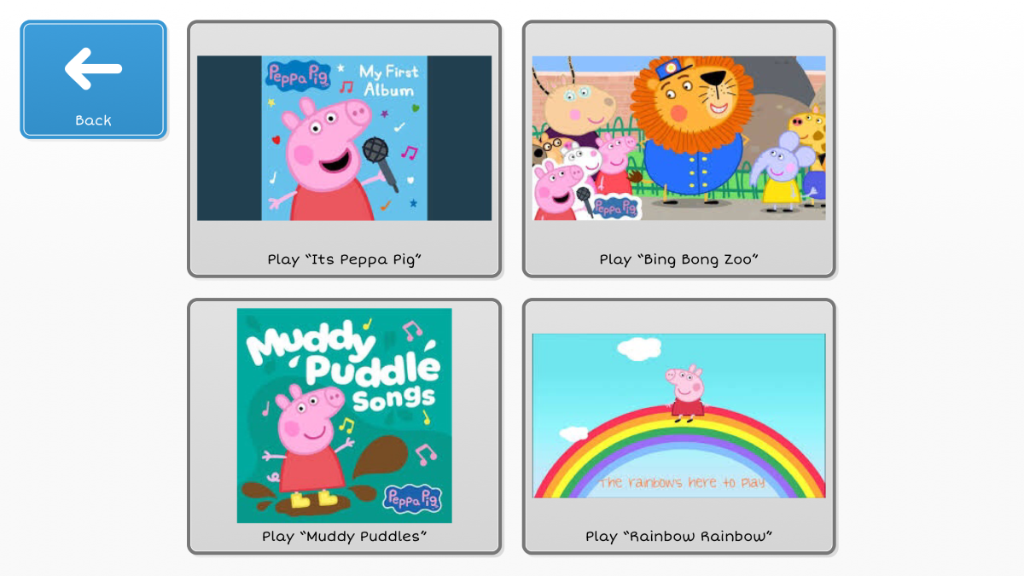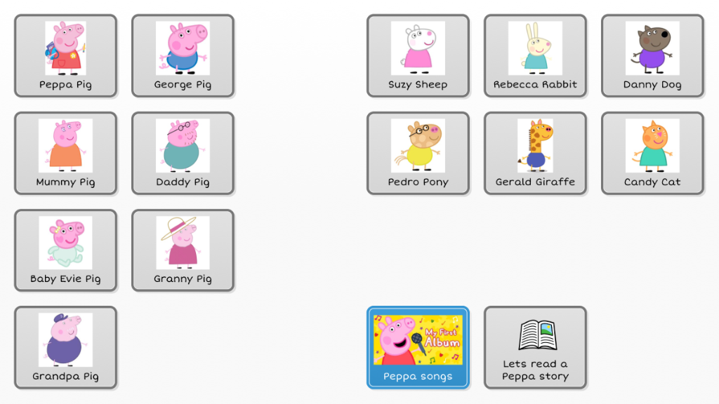 Peppa, family and friends. Includes buttons for requesting some favourite Peppa Pig songs.