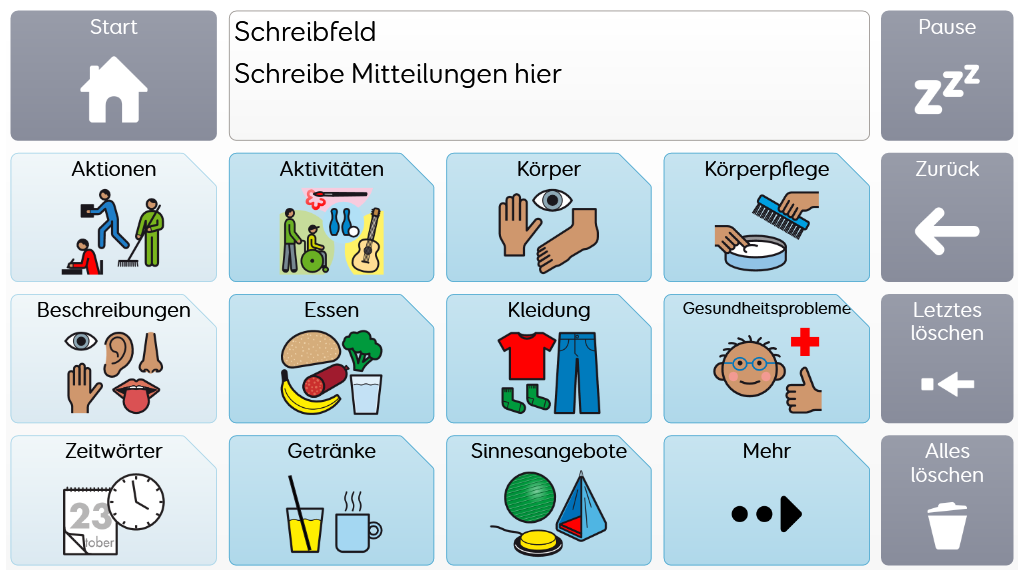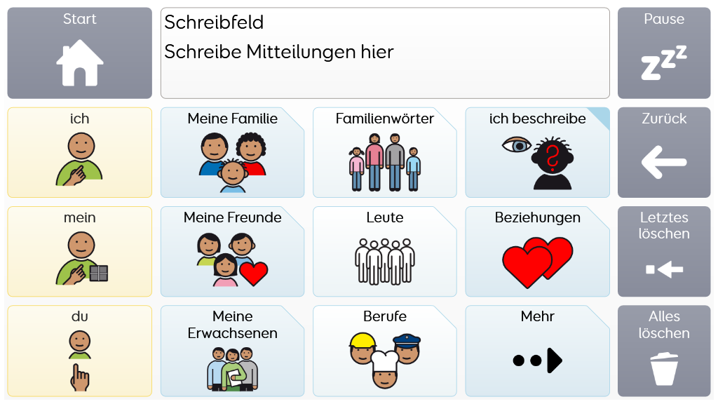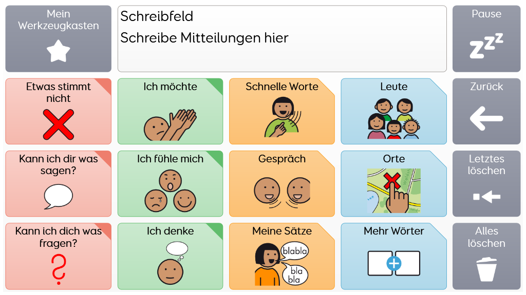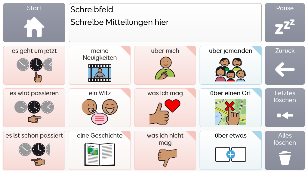 Voco Chat ist ein Symbolvokabular mit geringer Feldanzahl, dass es den NutzerInnen trotzdem ermöglicht, eine Vielzahl von Kommunikationsanlässen und -Funktionen auszudrücken. Das sorgfältig ausgewählte Vokabular sowie die automatische Bildung von Aussagen mittels direkten Verlinkungen - all das unterstützt den Zugang zur Sprache. Das Vokabular enthält Ressourcen zur Förderung der Kommunikation und der emotionalen Regulation bzw. weitere Apps wie Symoji und Kamera zur Unterstützung von Interaktion und Engagement. Voco Chat eignet sich für alle, die größere Felder benötigen und kann über Berührung, Blicke, Mausersatz und Schalter bedient werden. Auditive Hinweise fürs Scanning sind sowohl für Spalten als auch für einzelne Zellen enthalten. Wenn Sie Voco Chat zum ersten Mal öffnen, können Sie entweder "Kind" oder "Jugendlicher und Erwachsener" auswählen, um das am besten geeignete Vokabular für den Benutzer zu wählen. v1.05