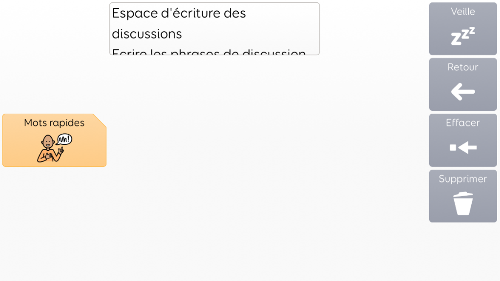 Voco Chat est un vocabulaire de symboles à faible nombre de cellules, qui permet aux utilisateurs de communiquer dans de nombreuses situations. Les voies de message (avec des sauts intégrés et un vocabulaire soigneusement sélectionné) offrent un système formel de la langue. L'ensemble de pages comprend des ressources pour soutenir la communication et le bien-être émotionnel, notamment avec des applications comme Symoji et Appareil photo pour favoriser l'interaction et l'engagement. Voco Chat convient à tous ceux qui ont besoin de cellules plus grandes, et peut être utilisé avec le toucher, la commande oculaire, le pointeur et les contacteurs. Des invites auditives sont incluses pour les colonnes et les cellules individuelles. Lorsque vous ajoutez Voco Chat pour la première fois, vous pouvez sélectionner « Enfant » ou « Ado et adulte » afin de choisir le vocabulaire le plus approprié pour l'utilisateur. v1.04