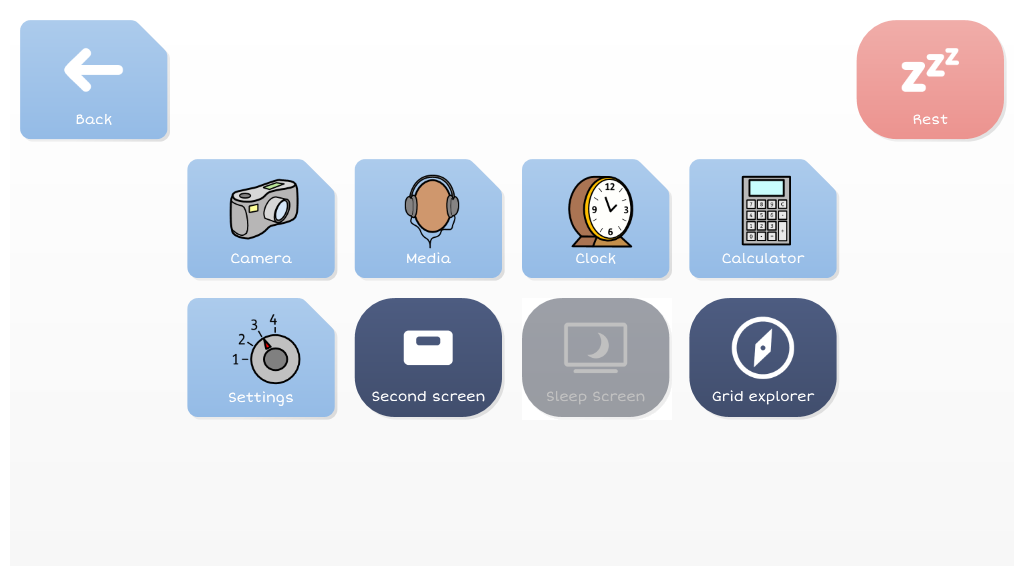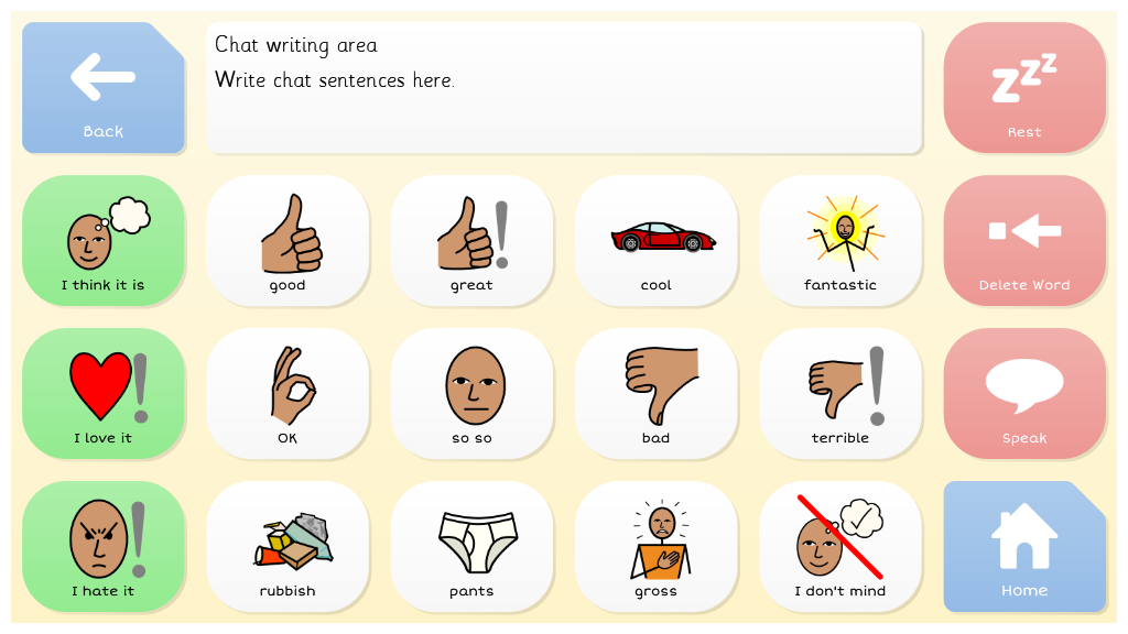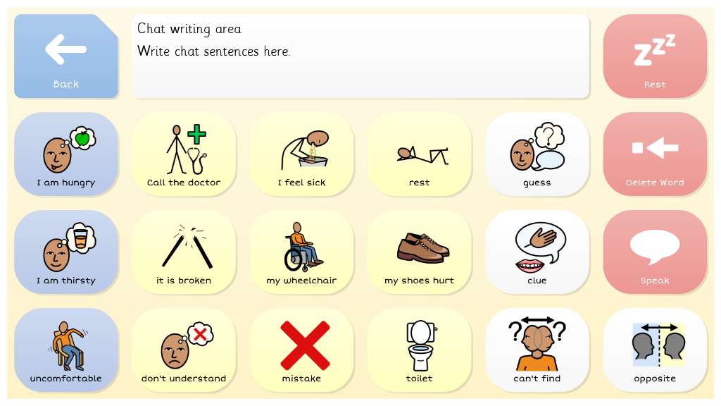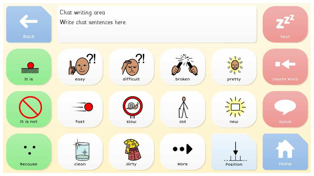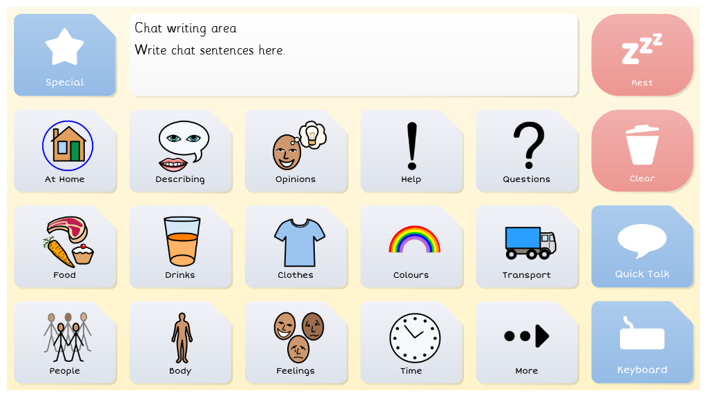A topic based vocabulary for beginning AAC users. On each topic grid, users can build simple sentences from one or two selections, using sentence starters and topic words. Grid size is 6x3