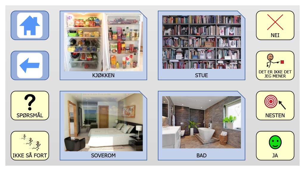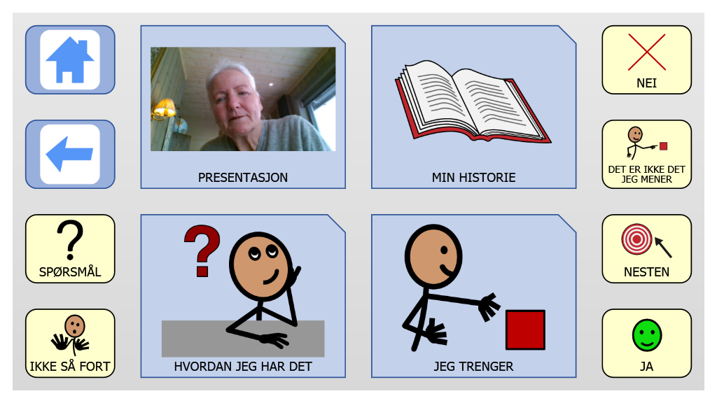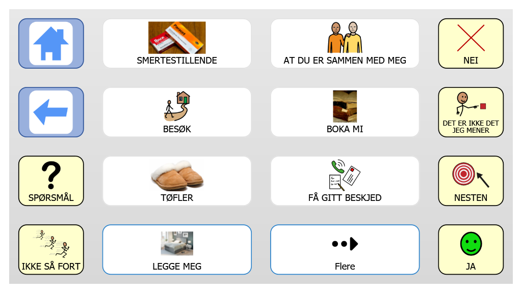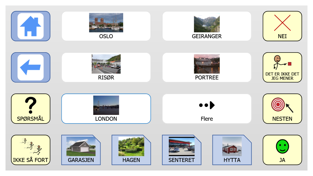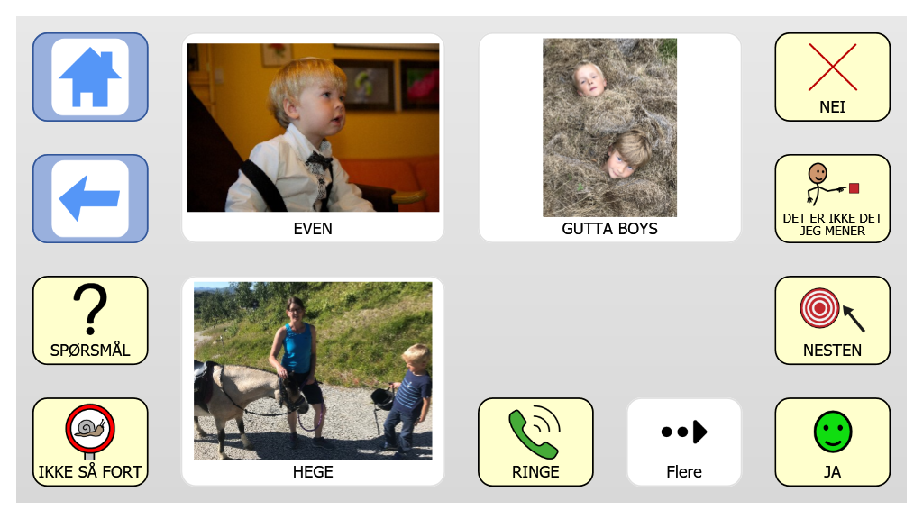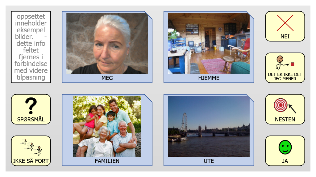 Enkelt startoppsett med 23 sider med 16 felt pr side, kontekstbasert ordleting, foto, store bokstaver, uten tastatur. Med informasjon om eksempel bilder benyttet med tillatelse. v1.04