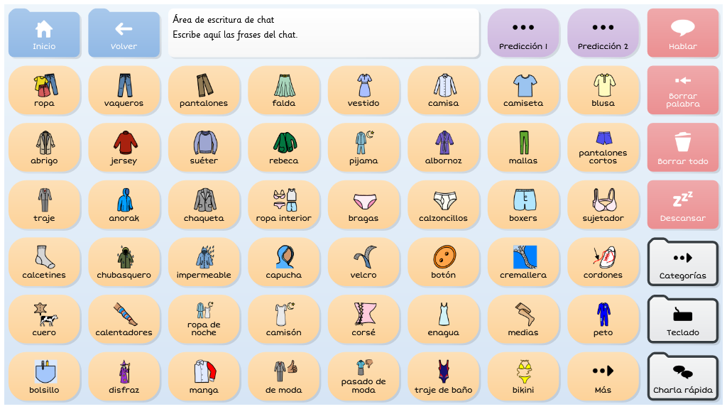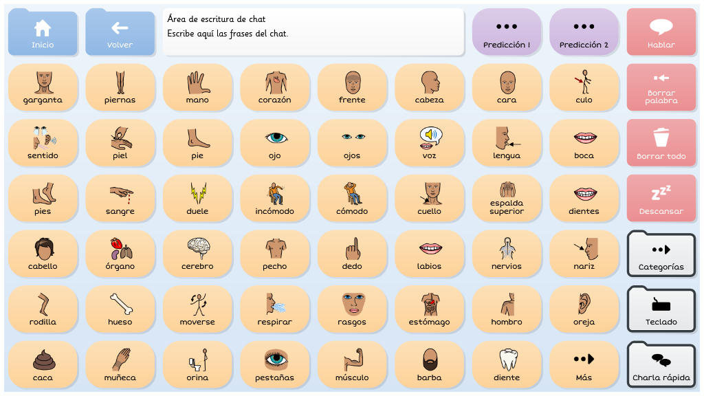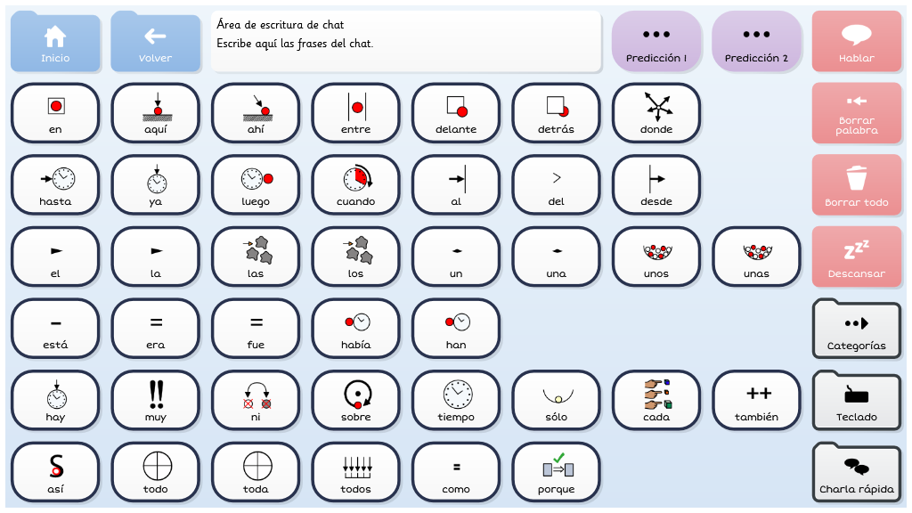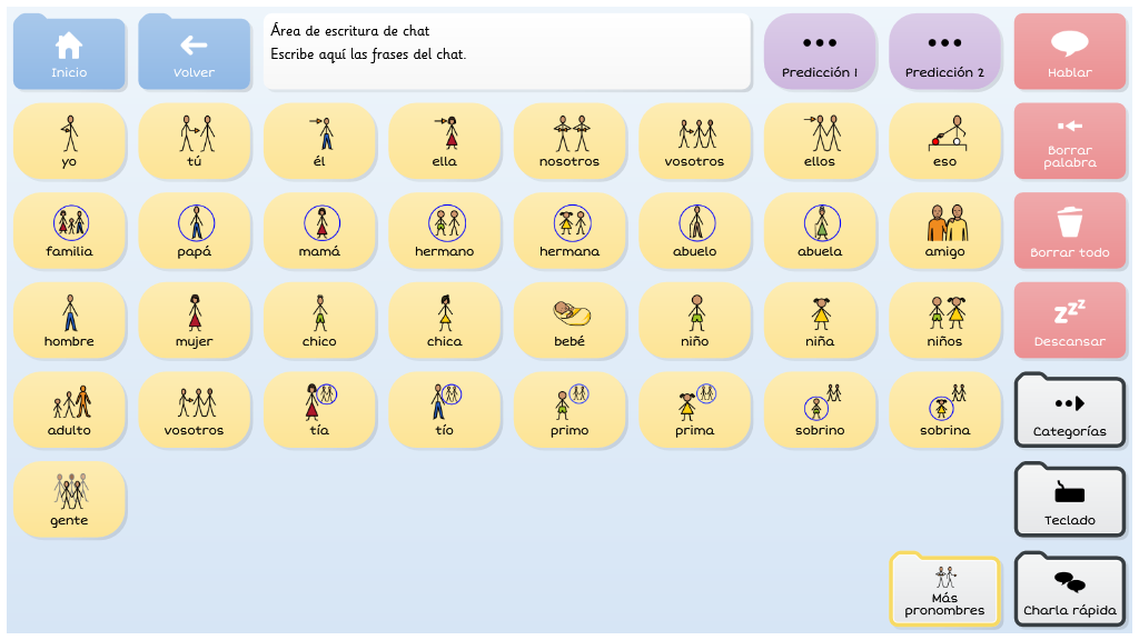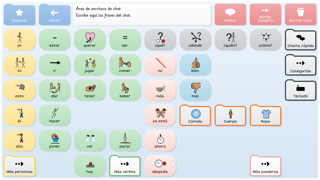 Symbol Talker Núcleo contiene el vocabulario núcleo en la página de inicio. Esto significa que puedes generar frases nuevas de manera rápida y acceder a las cuadrículas temáticas solo para encontrar palabras menos comunes. Las herramientas de gramática inteligente de Grid 3 te ayudarán a generar frases gramaticalmente correctas con pocas selecciones. Este gridset es una evolución de BJ Adaptaciones sobre Symbol Talker D