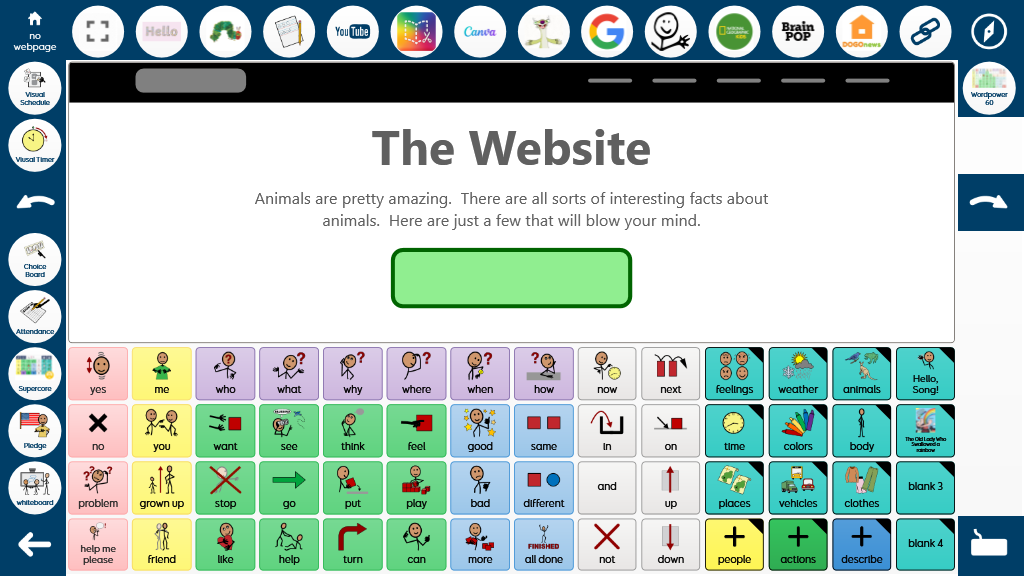 Super Core: See & Say is a versatile grid set designed for use on an interactive whiteboard. It features a built-in browser, allowing you to display slides, images, videos, or websites alongside Super Core vocabulary. Students can explore the topic and use core and customisable fringe words to communicate, while teachers and staff can model language in real-time to support learning. Ideal for whole-class participation, it creates an engaging, accessible, and inclusive learning experience.