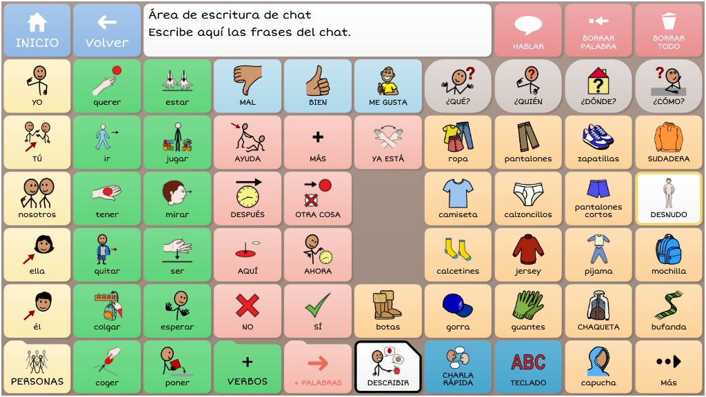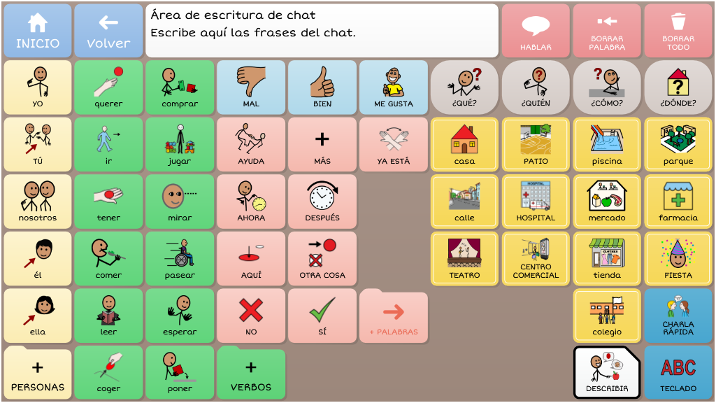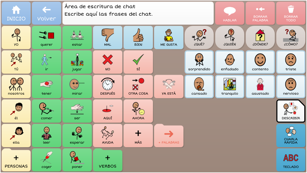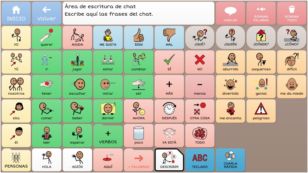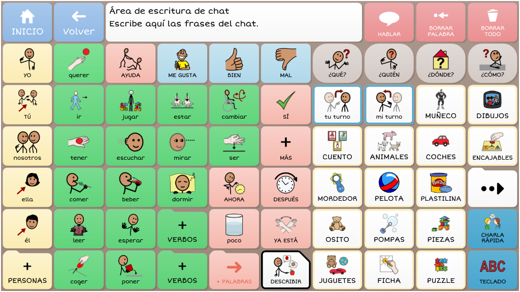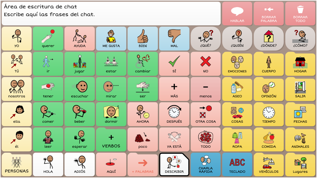 Modificación de Symbol Talker G divide la pantalla en dos partes: una destinada al vocabulario núcleo y otra al vocabulario periférico. Esto significa que puedes generar frases nuevas de manera rápida y adaptada al contexto. Las herramientas de gramática inteligente de Grid 3 te ayudarán a generar frases gramaticalmente correctas con pocas selecciones.