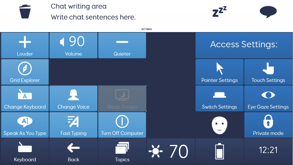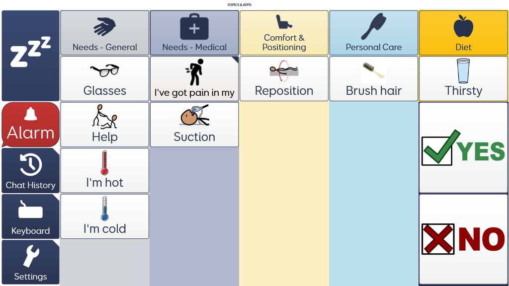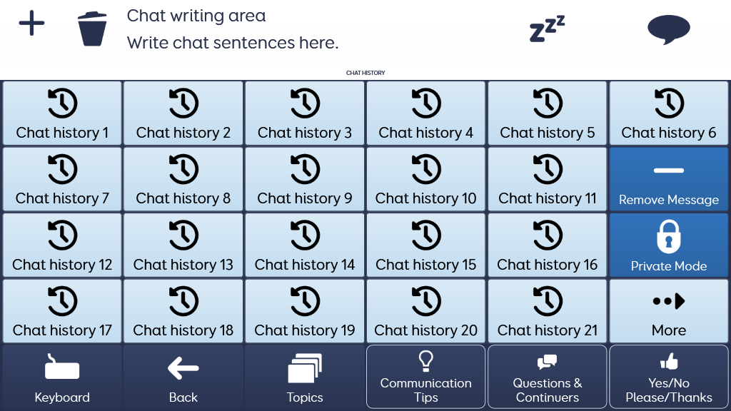 Alpha Core is a text-based AAC vocabulary designed to meet the communication needs of literate adults with changing physical abilities, such as ALS or MND. It gives users a choice of seven keyboards, and the flexibility to change to another at any time. Each keyboard has quick access to useful phrases and topics, prediction and chat history to speed up communication. Built-in accessible apps allow users to send emails, text messages, browse the web, watch YouTube and use message banking. Created by Amy Roman (MS, CCC-SLP) based on over 20 years of clinical experience, and with input from adults with ALS, their families, care givers and therapists. v1.03