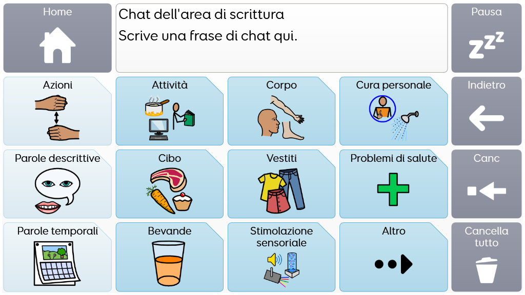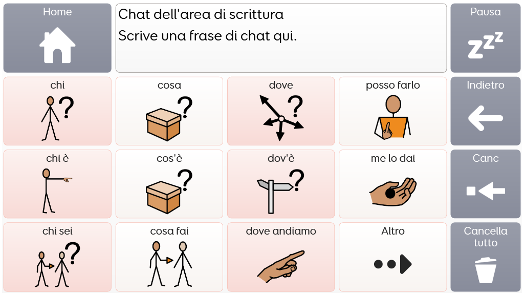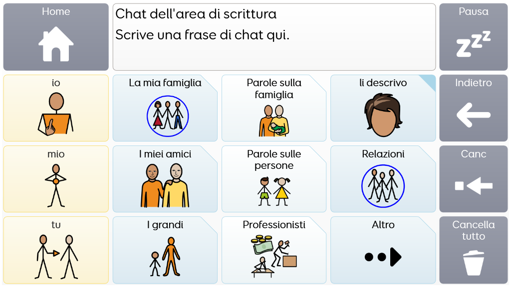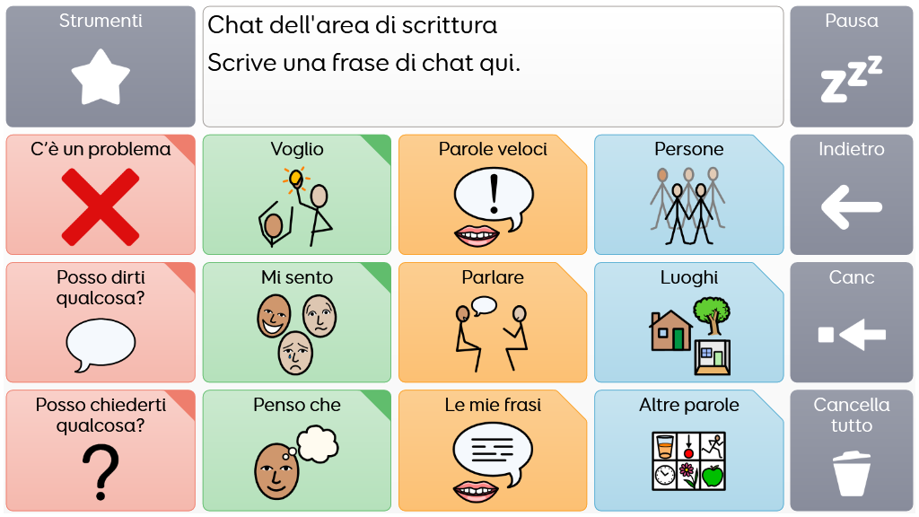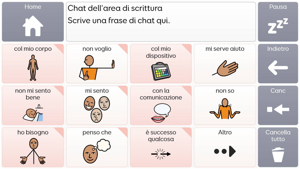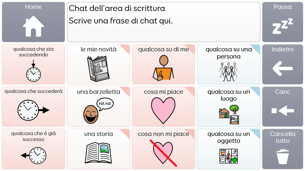 Voco Chat è un vocabolario basato su simboli e caratterizzato da un basso numero di celle che aiuta gli utenti a soddisfare svariate esigenze comunicative. I percorsi di comunicazione, comprensivi di "salti" predefiniti e di un vocabolario accuratamente selezionato, offrono un approccio assistito alla comunicazione verbale. Le griglie includono risorse pensate per favorire la comunicazione e il benessere emotivo, con applicazioni quali la fotocamera e Symoji che stimolano l'interazione e il coinvolgimento. Voco Chat è particolarmente indicato per utenti che necessitano di celle di più grandi dimensioni, e può essere utilizzato interagendo con il touchscreen o mediante comunicatore oculare, puntatore e interruttori. Il sistema è comprensivo di rinforzi acustici sia per le colonne che per le singole celle. Quando si aggiunge Voco Chat per la prima volta, è possibile selezionare l'opzione "Adulti e adolescenti" o "Infanzia" in base al vocabolario più adatto all'utente. v1.04