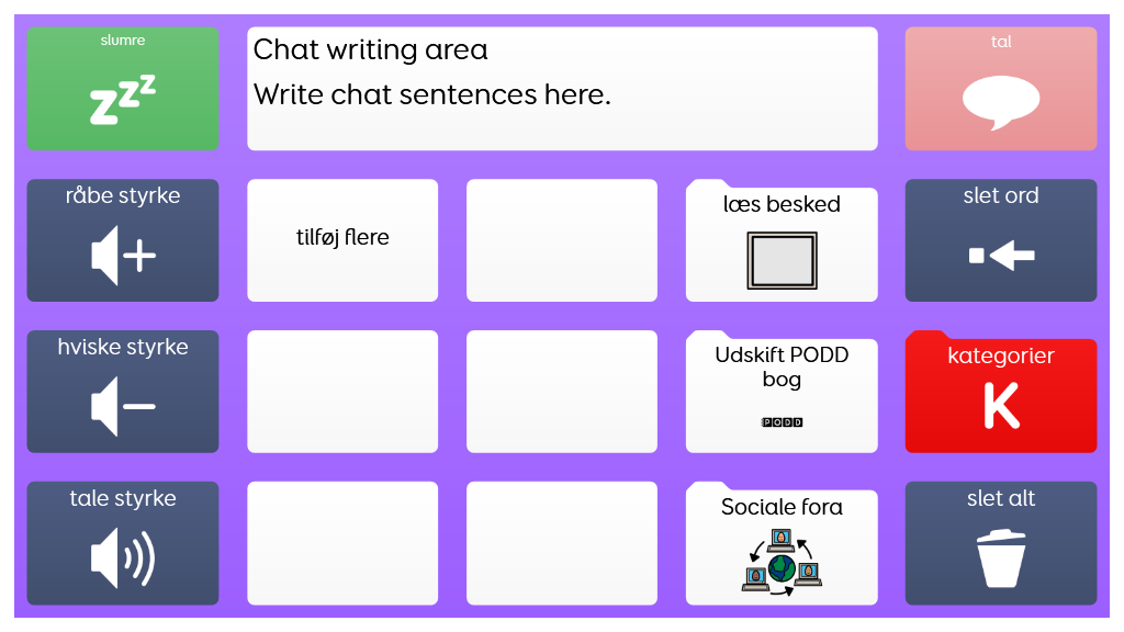Designet til børn, der påbegynder deres kommunikationsrejse, med førskolespecifikt ordforråd til børnehave og emner. Ordforråd og organisering minder mest om PODD 12 per side med udvidede funktioner. PODD for Grid er udarbejdet i samarbejde med Gayle Porter, skaberen af PODD. Dette layout er tilpasset brugere der benytter øjenstyring.