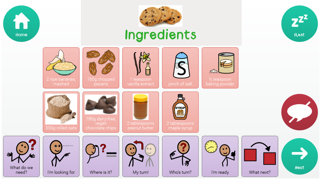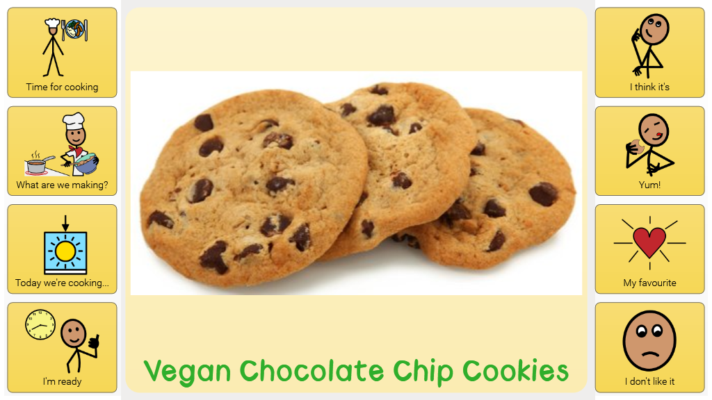 This gridset is for Vegan Chocolate Chip Recipe, however, it can be used as a template for creating and storing symbolised recipes in Grid 3.