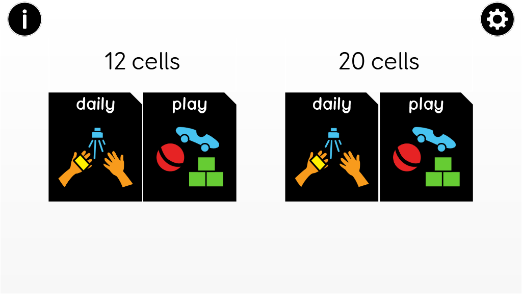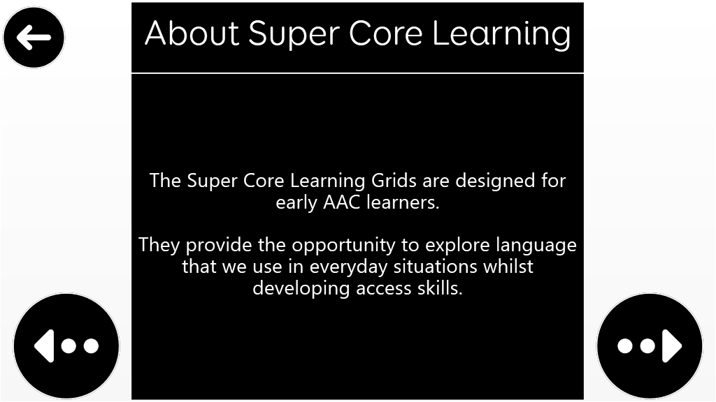 The Super Core Learning grids offer a gentle progression to the full Super Core symbol vocabulary, and an opportunity to build confidence with symbol AAC. They include all of the daily and play activity vocabulary from Super Core, alongside a simplified core vocabulary with a lower cell count of 12 and 20 cells. This grid set uses high contrast symbols which are intended to improve their visibility for users with visual impairment (i.e. simplified symbols, and brighter colours). The Super Core Learning Grids are also available in standard PCS and Widgit symbols. v2.0