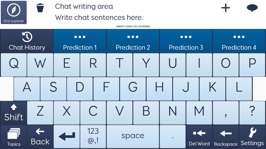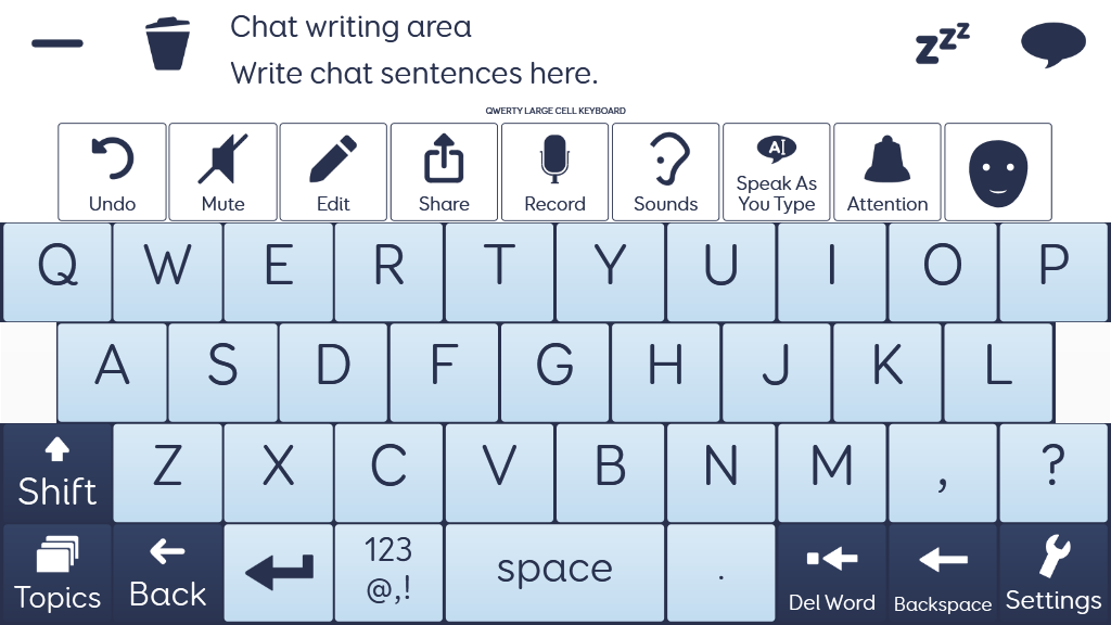 Alpha Core is a text-based AAC vocabulary designed to meet the communication needs of literate adults with changing physical abilities, such as ALS or MND. It gives users a choice of seven keyboards, and the flexibility to change to another at any time. Each keyboard has quick access to useful phrases and topics, prediction and chat history to speed up communication. Built-in accessible apps allow users to send emails, text messages, browse the web, watch YouTube and use message banking. Created by Amy Roman (MS, CCC-SLP) based on over 20 years of clinical experience, and with input from adults with ALS, their families, care givers and therapists. v1.03