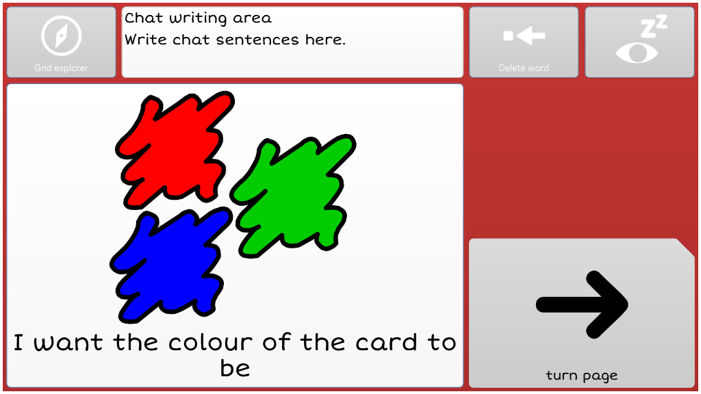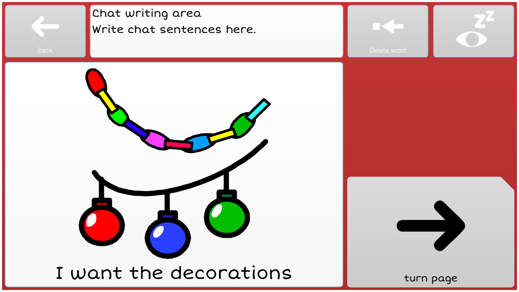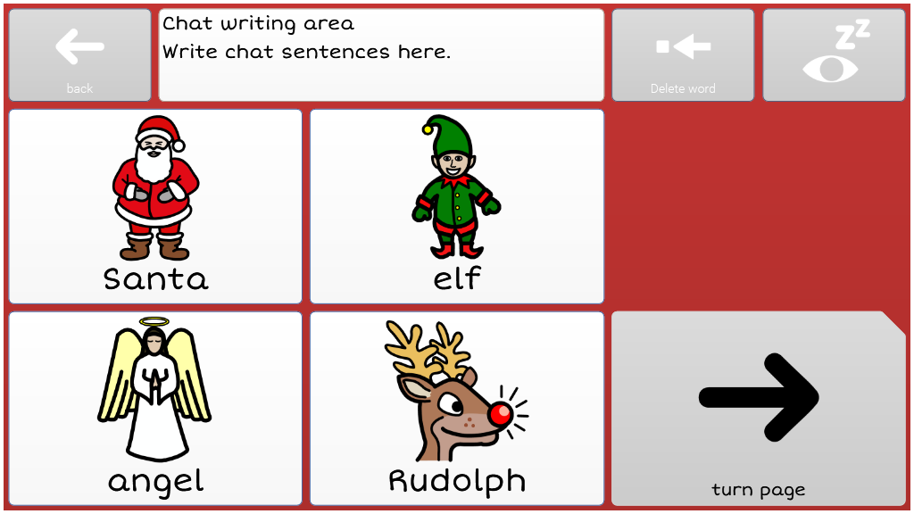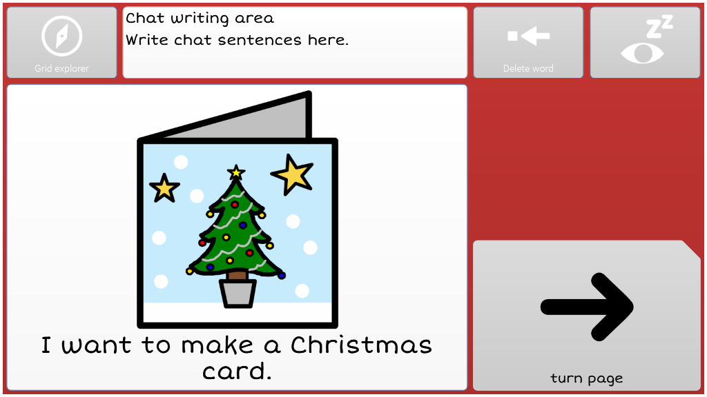 This grid set allows symbol users to design their own Christmas card. At the end of the gridset, you can choose to write more, print your ideas, read your Christmas card ideas back, or start again.