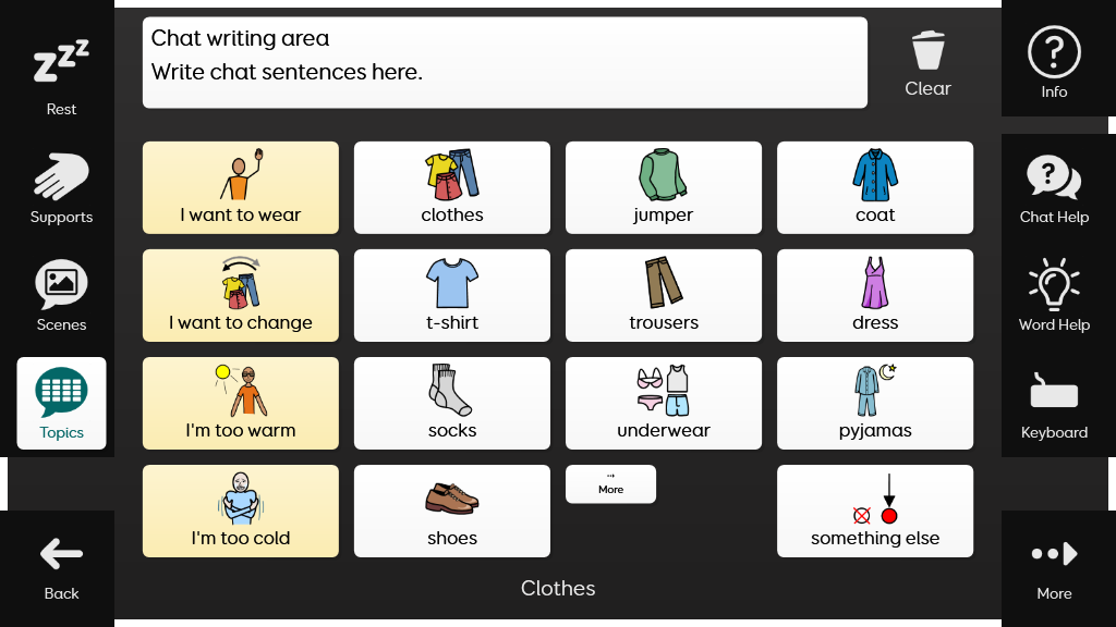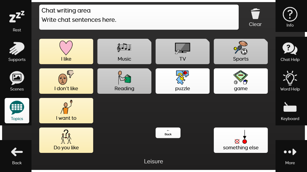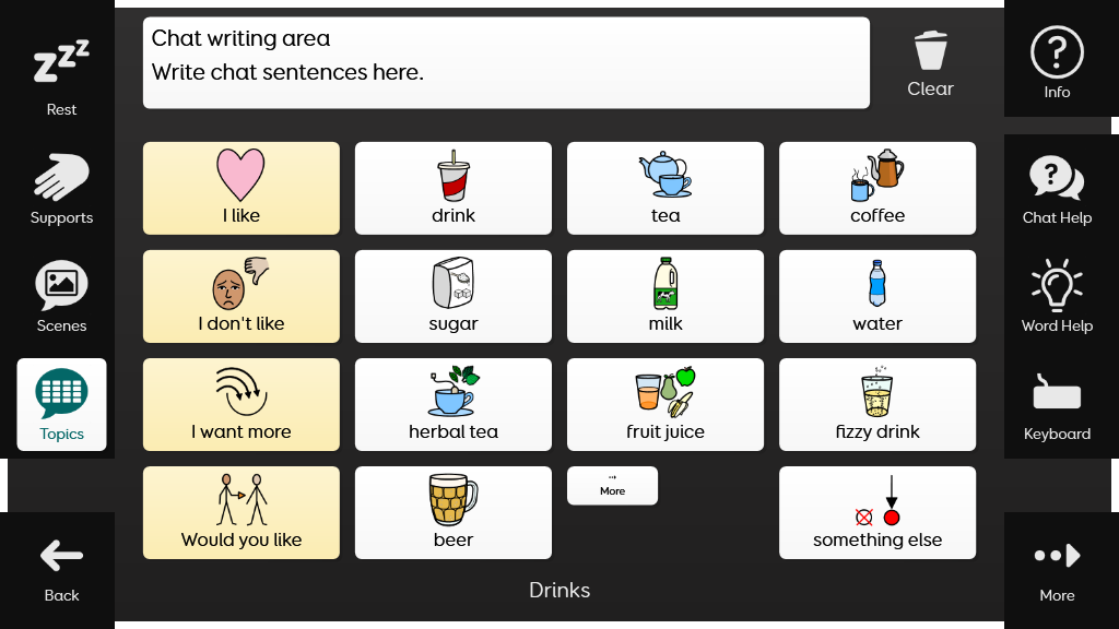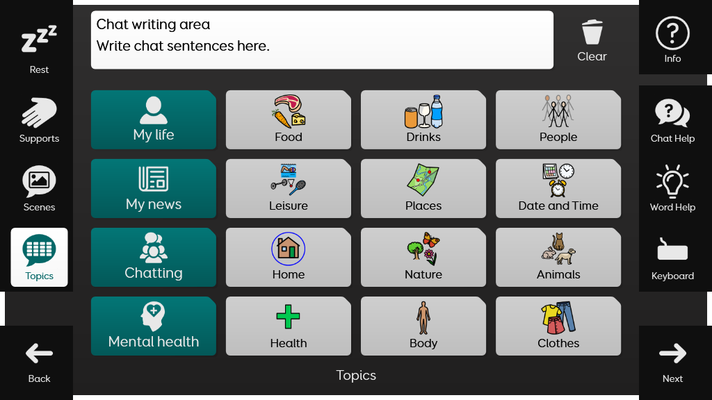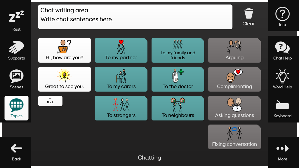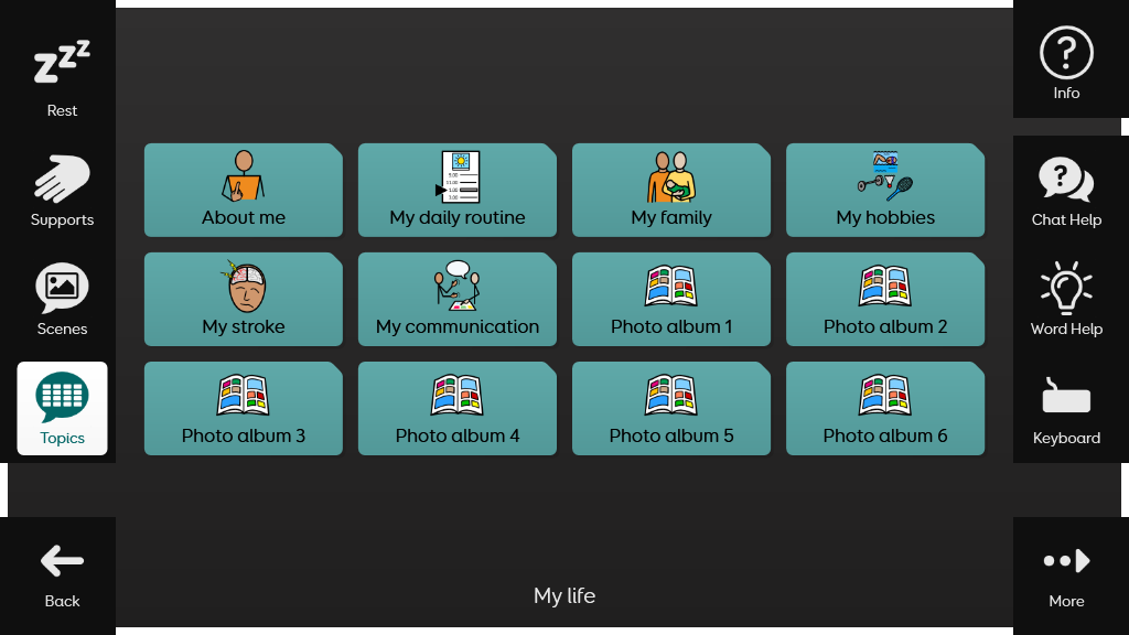 Aphasia Duo has been created for adults who have aphasia, who would benefit from a symbol supported vocabulary. Its aim is to enable people with aphasia to communicate for a wide range of reasons, with help from a range of communication supports. Aphasia Duo 16 may be better suited to those with less severe language, cognitive, visual or physical difficulties, or for individuals where word finding is their main difficulty. It includes tools to support word finding, such as picture dictionaries and a word bank. Aphasia Duo is compatible with keyguards, and can be used with any access method. v1.3 Note: This grid set requires Grid version 94 or above