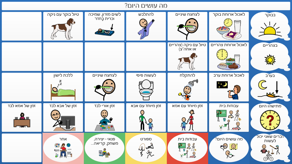 לוח לארגון סדר יום בתקופת הקורונה ובכלל. מומלץ להדפסה כספרון ו/או ככרטיסיות. שרון שחם, קלינאית תקשורת, מרכז אומר לתקשורת תומכת וחליפית.