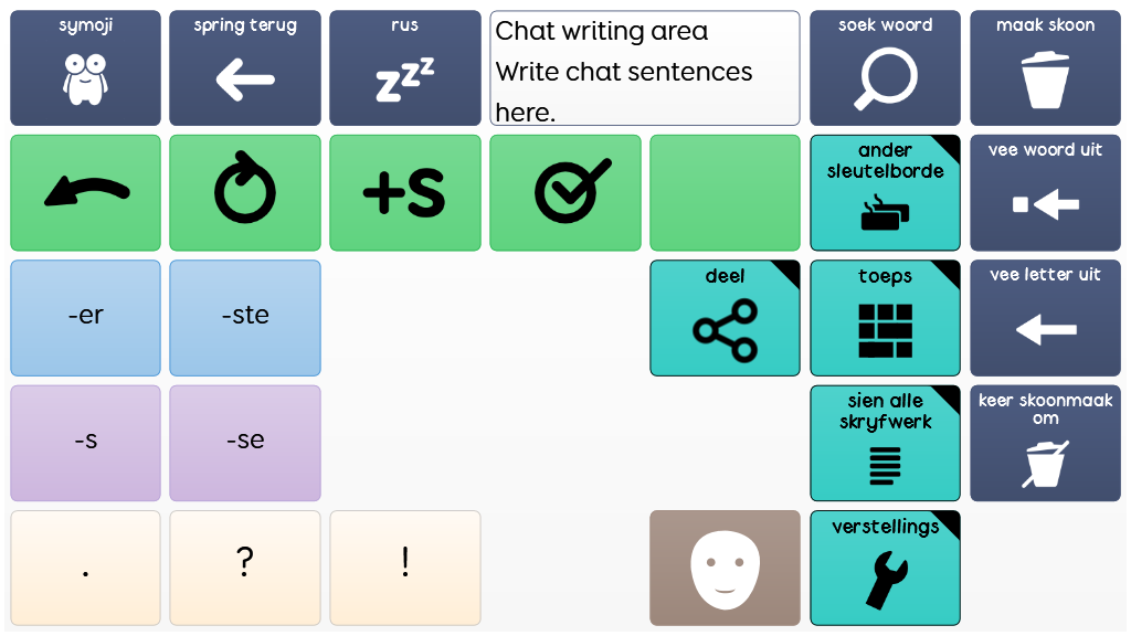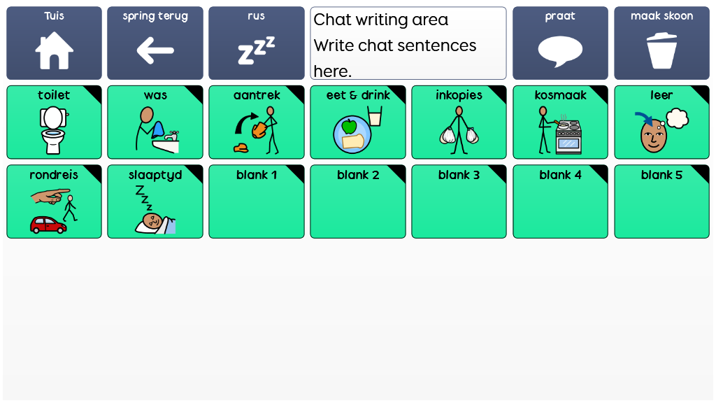 Hierdie maklik-om-te-gebruik woordeskat is ontwerp om vroeƫ AAK gebruikers sukses te laat ervaar in kommunikasie met simbole. Dit kombineer kernwoordeskat met konteks taal, gefokus op daaglikse roetine en speel aktiwiteite om kommunikasie betekenisvol en motiverend te hou!