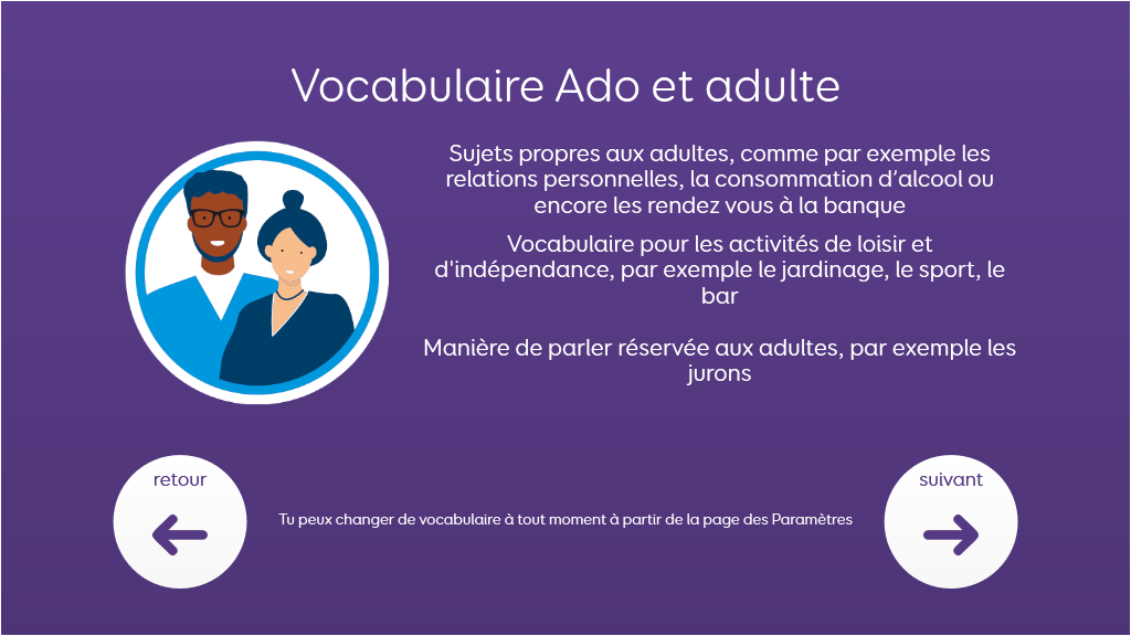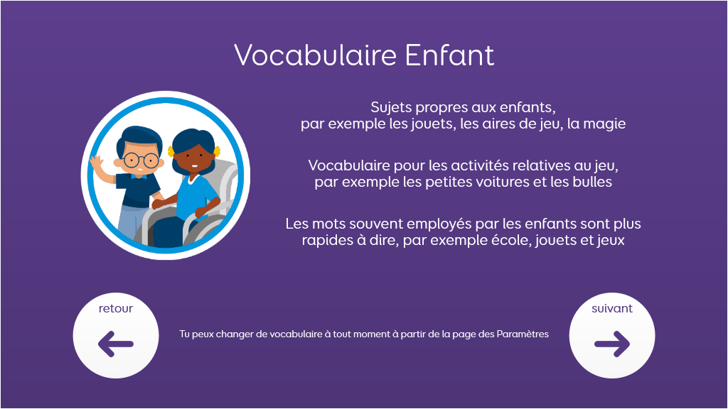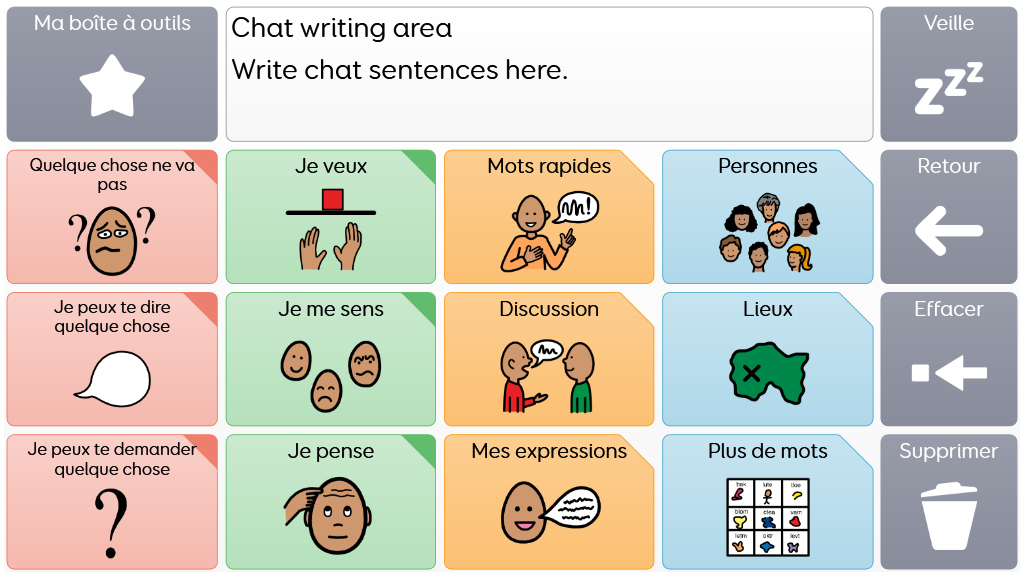 Voco Chat est un vocabulaire de symboles à faible nombre de cellules, qui permet aux utilisateurs de communiquer dans de nombreuses situations. Les voies de message (avec des sauts intégrés et un vocabulaire soigneusement sélectionné) offrent un système formel de la langue. L'ensemble de pages comprend des ressources pour soutenir la communication et le bien-être émotionnel, notamment avec des applications comme Symoji et Appareil photo pour favoriser l'interaction et l'engagement. Voco Chat convient à tous ceux qui ont besoin de cellules plus grandes, et peut être utilisé avec le toucher, la commande oculaire, le pointeur et les contacteurs. Des invites auditives sont incluses pour les colonnes et les cellules individuelles. Lorsque vous ajoutez Voco Chat pour la première fois, vous pouvez sélectionner « Enfant » ou « Ado et adulte » afin de choisir le vocabulaire le plus approprié pour l'utilisateur. v1.05