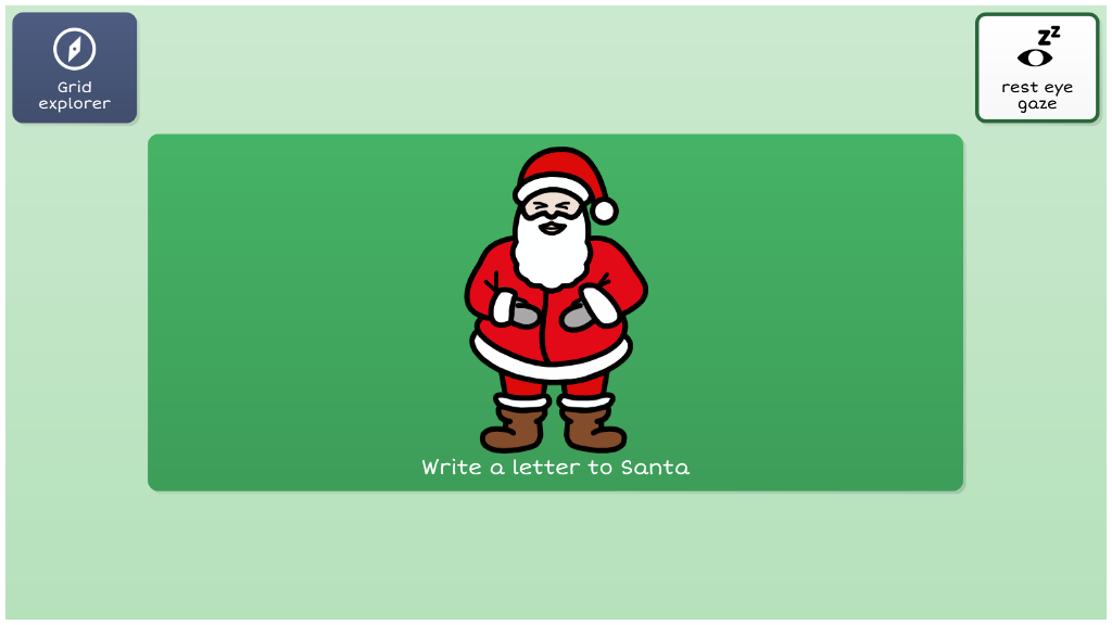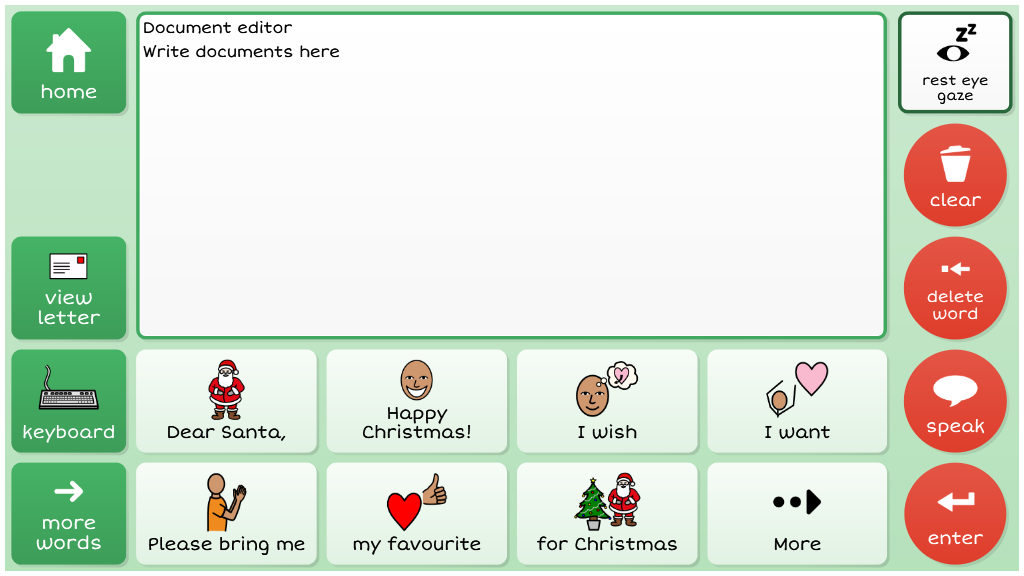 This Gridset is designed to support users to write a letter to Santa. It includes phrases and vocabulary for support and a keyboard for free writing. Phrases and Vocabulary are presented in a word list so it can be easily edited. In user mode select the menu bar and word list and add or remove words from the list. Once finished you could print the letter to send to him.