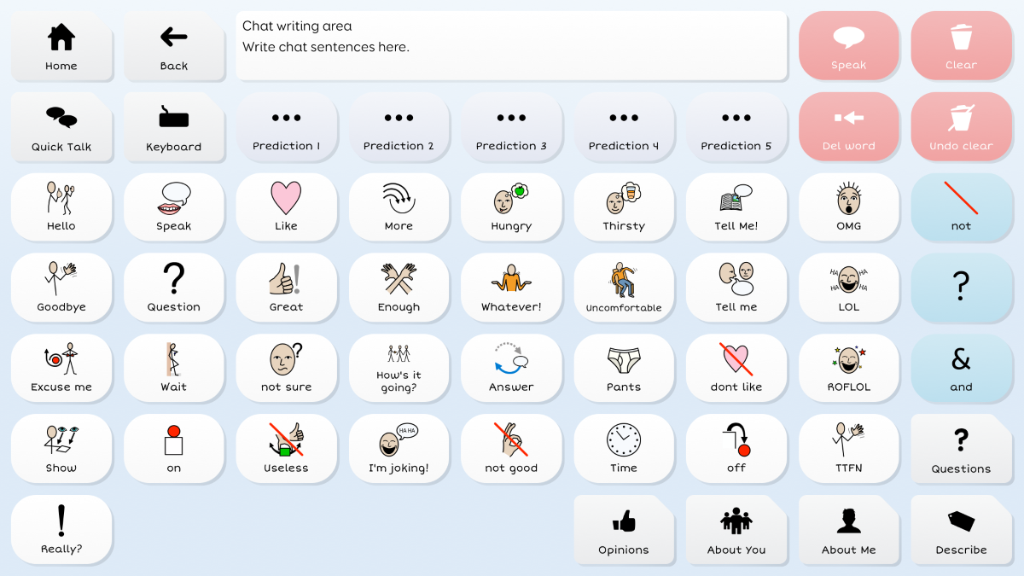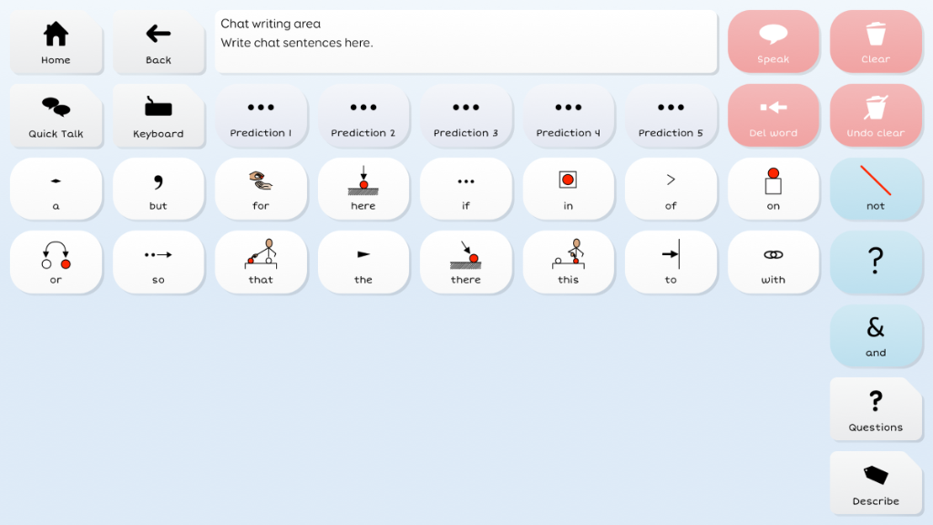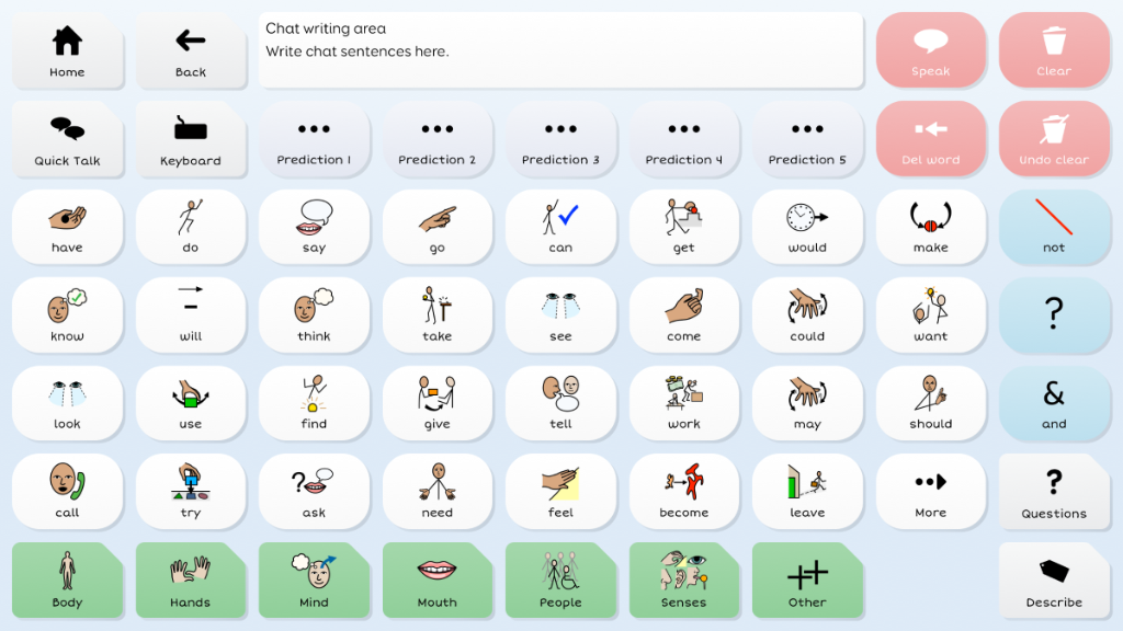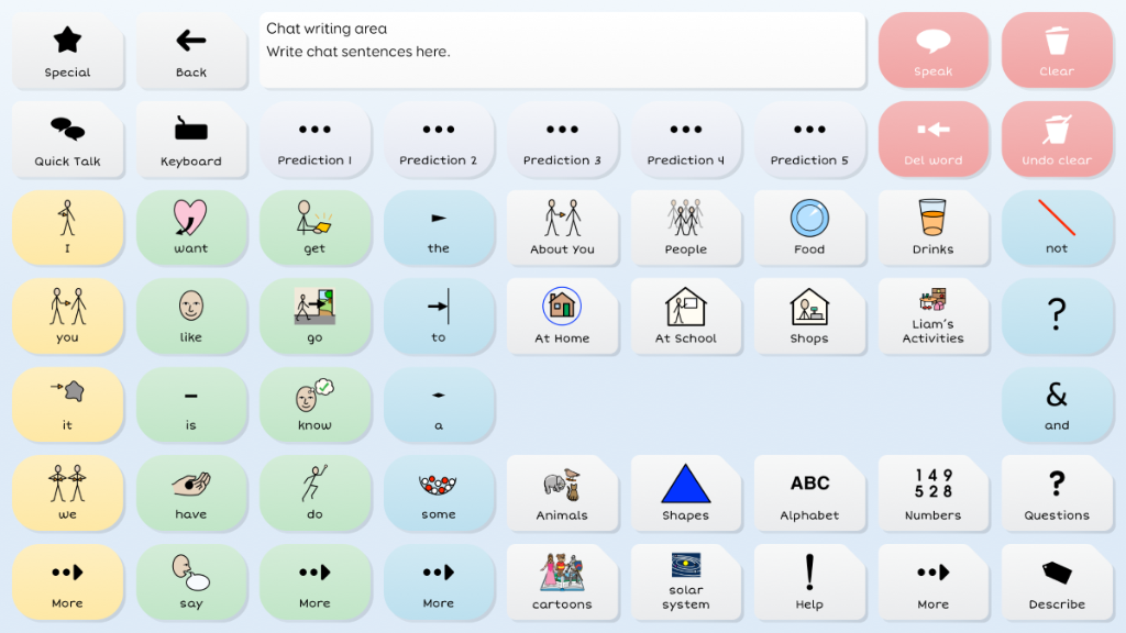 Symbol Talker D promotes core vocabulary on the home page. This means you can generate novel sentences very quickly and you only need to visit topic pages to find less common words such as nouns. The smart grammar tools in Grid 3 help you generate grammatically correct sentences with fewer selections.