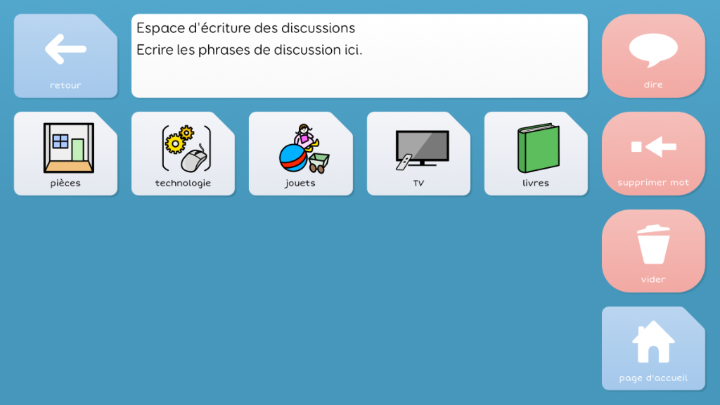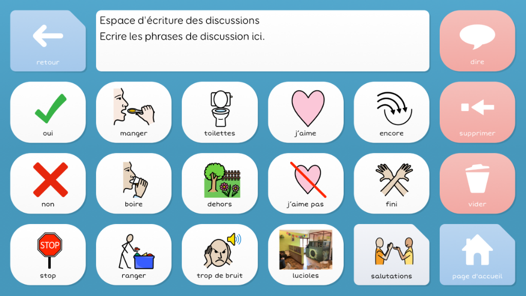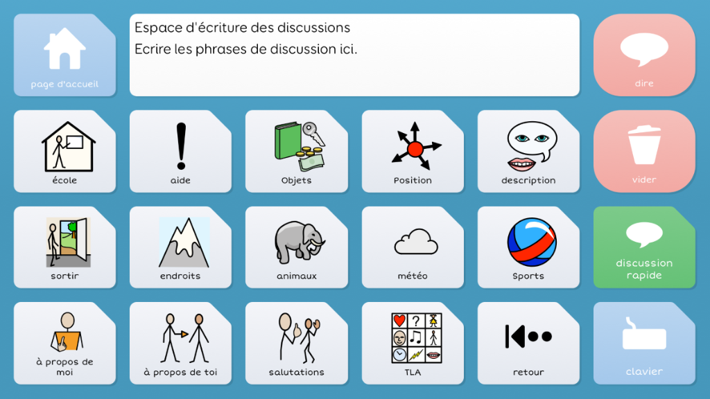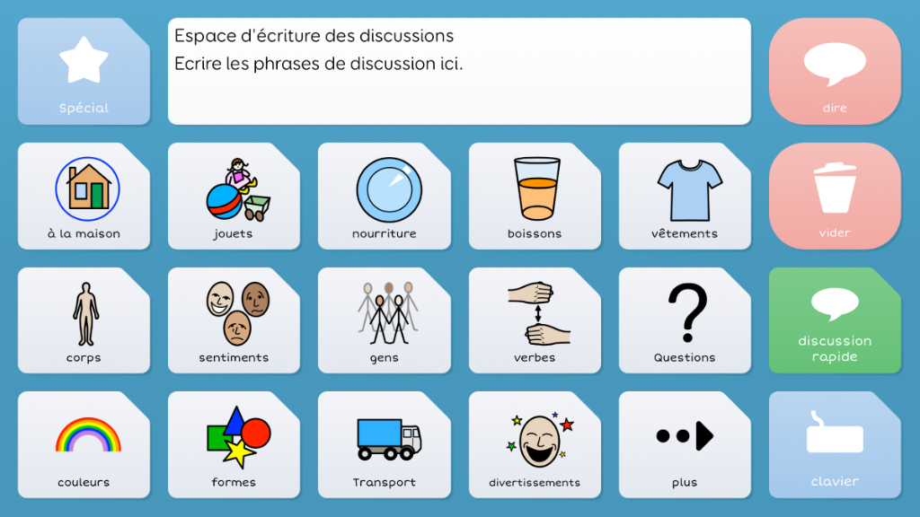 Symbol Talker est un ensemble de vocabulaire complet pour ceux qui souhaitent utiliser des symboles pour parler. Il contient des pages pour le vocabulaire général, ainsi que des pages pour les thèmes de l'école, de la maison et de la thérapie.