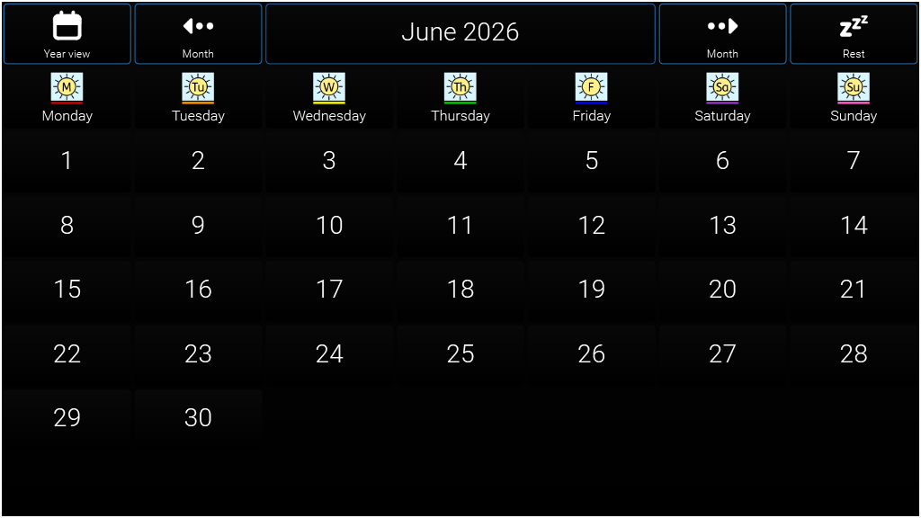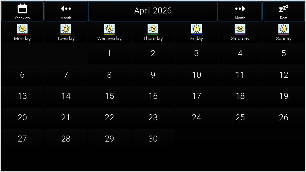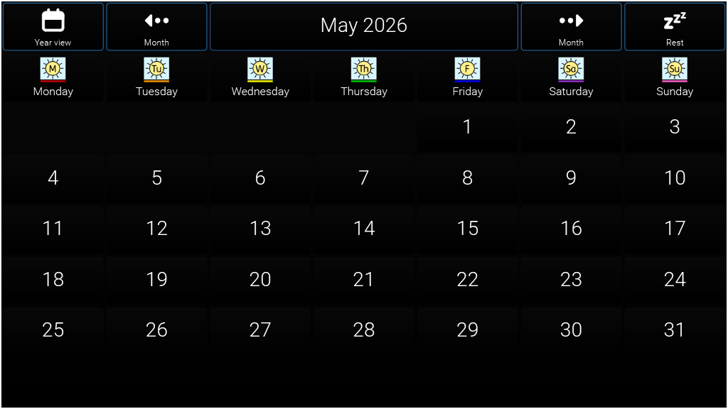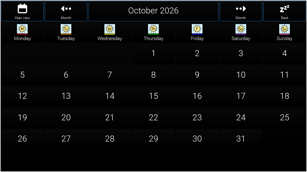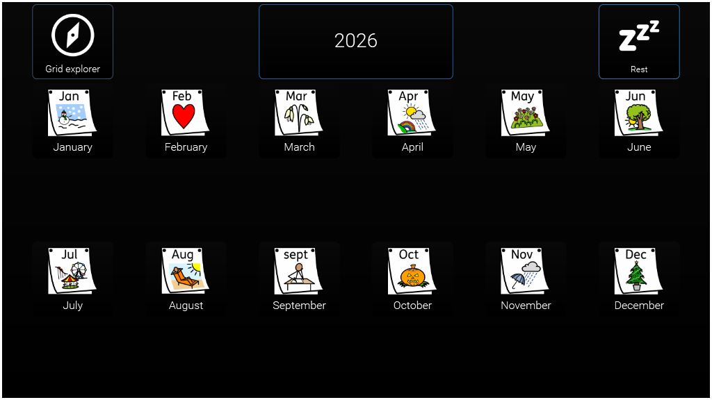 A user controlled calendar for 2026 adjusted for High Visability The calendar app for Grid 3 was developed by Jamie Preece, an AAC user living in the UK who uses a joystick to operate his device. Smartbox worked with Jamie to complete the app based on his original idea.