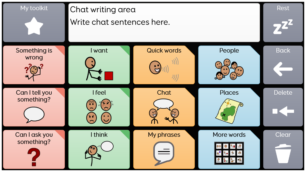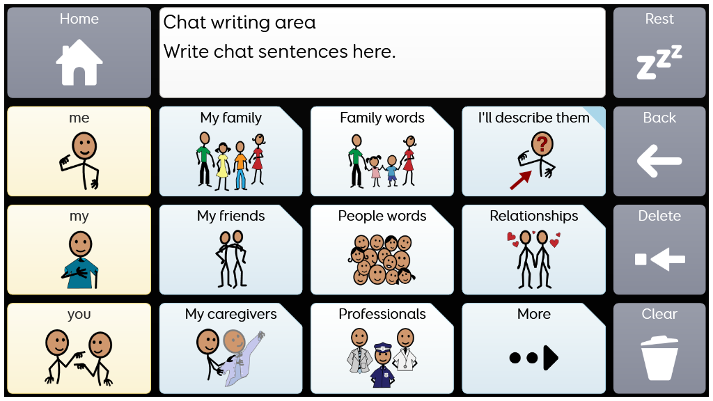 Voco Chat is a low-cell count symbol vocabulary, designed to enable users to communicate for a wide range of reasons. Message pathways, with built-in jumps and carefully selected vocabulary, provide a supported approach to language. The grid set includes resources for supporting communication and emotional wellbeing, with apps such as Symoji and Camera to support interaction and engagement. Voco Chat is suitable for anyone who needs larger cells, and can be used with touch, eye gaze, pointer and switches. Auditory prompts are included for both columns and individual cells. When you add Voco Chat for the first time, you can select either ‘Child’ or ‘Teen and Adult’ in order to choose the most appropriate vocabulary for the user. v1.05