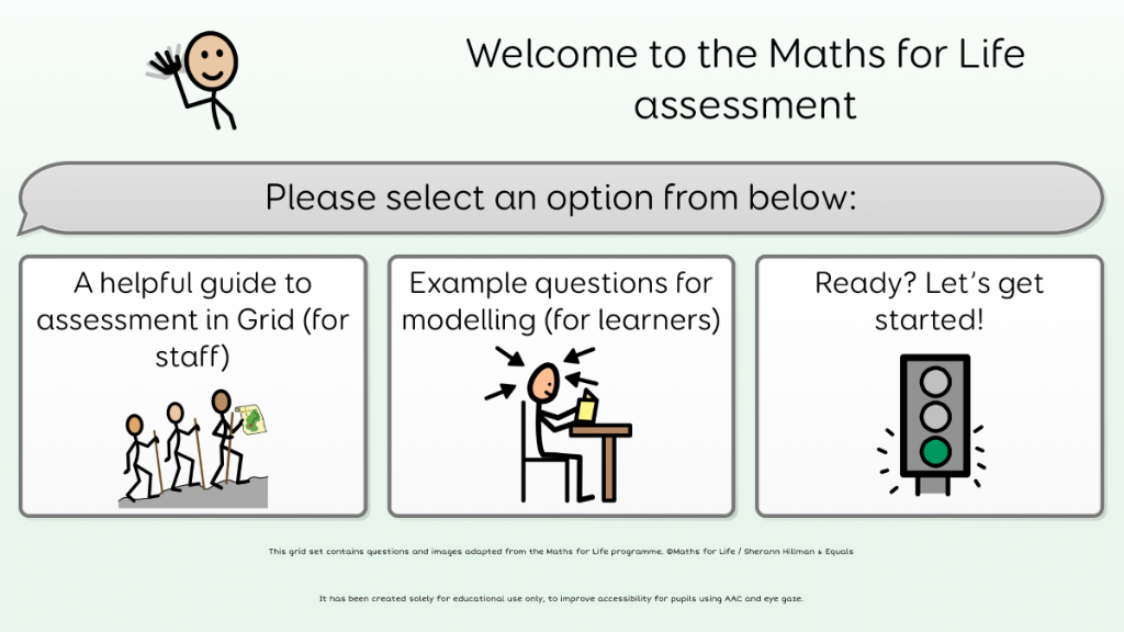 This Grid set is an accessibility-adapted version of Foundation Level assessment (FLA001) from the Maths for Life programme. It has been created to support pupils who use AAC, eye gaze or alternative access methods to engage with the assessment content in a meaningful way. This resource includes adapted wording and images from Maths for Life. © Maths for Life / Equals / Sherann Hillman. This Grid set is shared for noncommercial educational use only. Please ensure that your school or setting holds a license or purchased copy of Maths for Life before using this material.