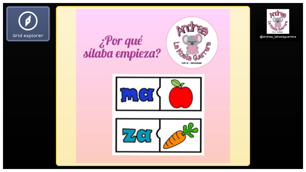 POR QUE SÍLABA EMPIEZA consta de 18 cuadrículas, 16 de ellas de elegir por qué sílaba empieza la palabra que nos aparece. Creado por @andrea_lakoalaguerrera