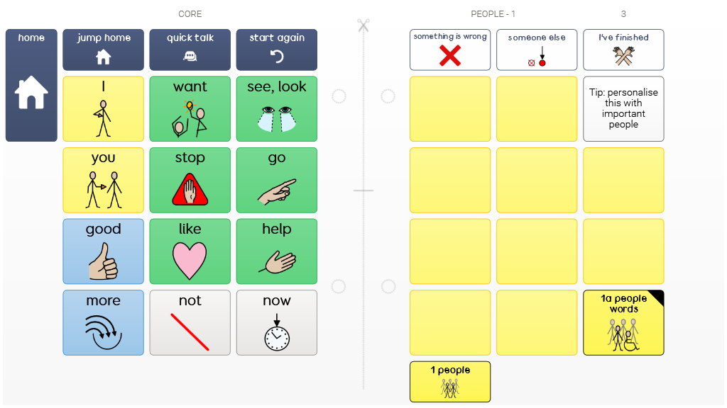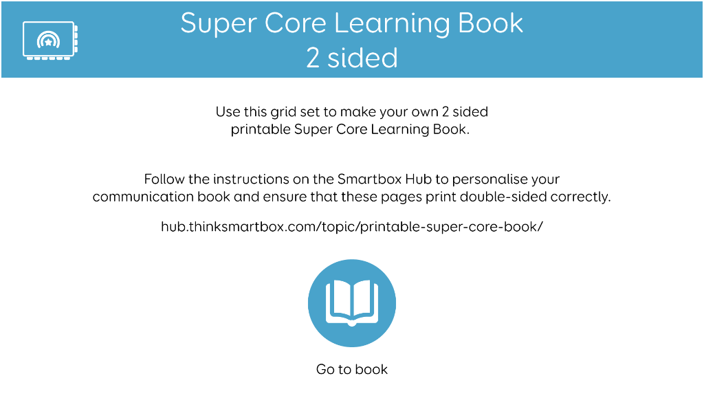 Super Core Printable Books are grid sets based on the Super Core language system, designed to be personalised within Grid software. Once printed, cut out and assembled, they form paper-based communication books which can be used anytime, anywhere. Printable books contain consistent core words, language for daily and play activities and short phrases. Find guidance on personalising and printing them on the Smartbox Hub. This grid set contains vocabulary tailored to children and forms a compact double sided book with 4x6 cells. Note: Ensure you are using Grid version 93 for the latest print settings v 1.02