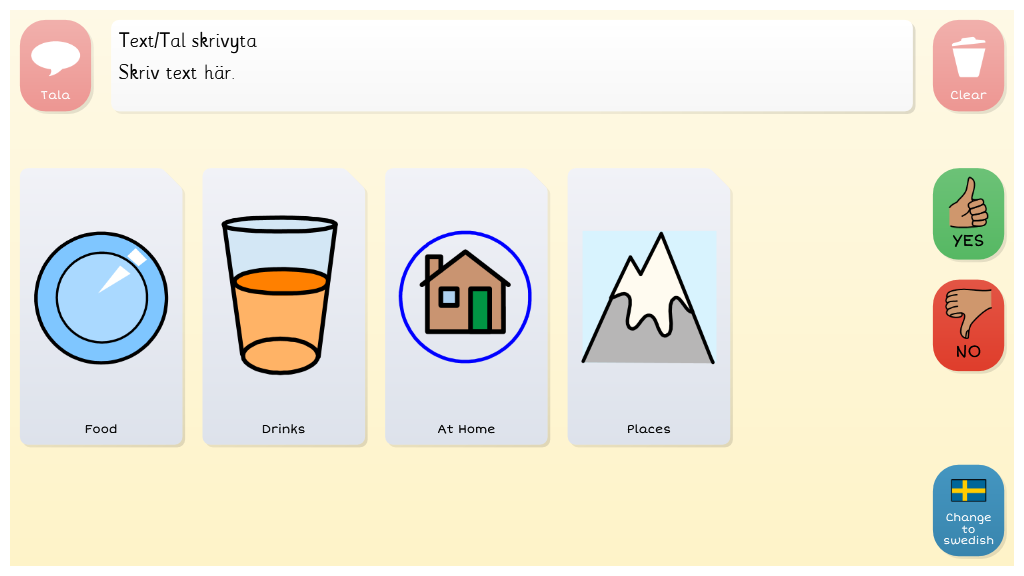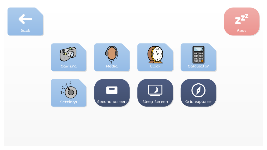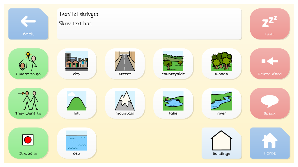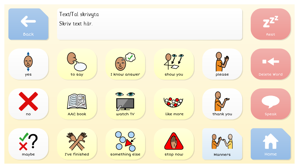 A topic based vocabulary for beginning AAC users. On each topic grid, users can build simple sentences from one or two selections, using sentence starters and topic words. Grid size is 6x3