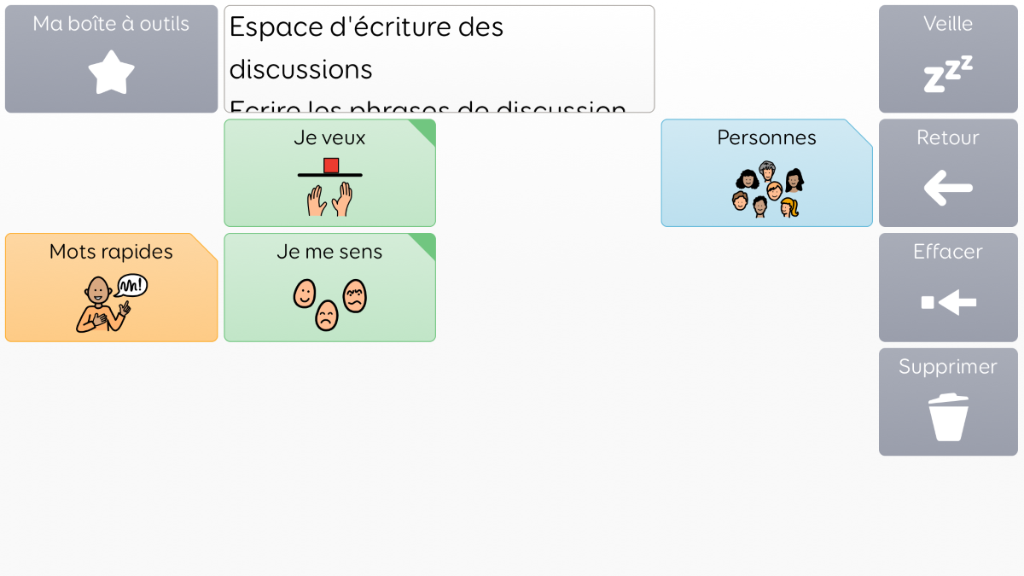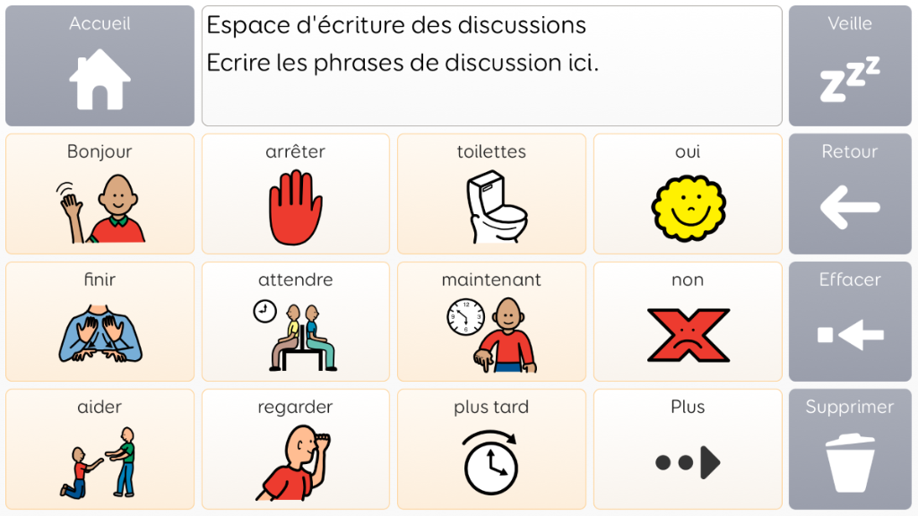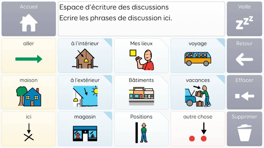 Voco Chat est un vocabulaire de symboles à faible nombre de cellules, qui permet aux utilisateurs de communiquer dans de nombreuses situations. Les voies de message (avec des sauts intégrés et un vocabulaire soigneusement sélectionné) offrent un système formel de la langue. L'ensemble de pages comprend des ressources pour soutenir la communication et le bien-être émotionnel, notamment avec des applications comme Symoji et Appareil photo pour favoriser l'interaction et l'engagement. Voco Chat convient à tous ceux qui ont besoin de cellules plus grandes, et peut être utilisé avec le toucher, la commande oculaire, le pointeur et les contacteurs. Des invites auditives sont incluses pour les colonnes et les cellules individuelles. Lorsque vous ajoutez Voco Chat pour la première fois, vous pouvez sélectionner « Enfant » ou « Ado et adulte » afin de choisir le vocabulaire le plus approprié pour l'utilisateur. v1.04