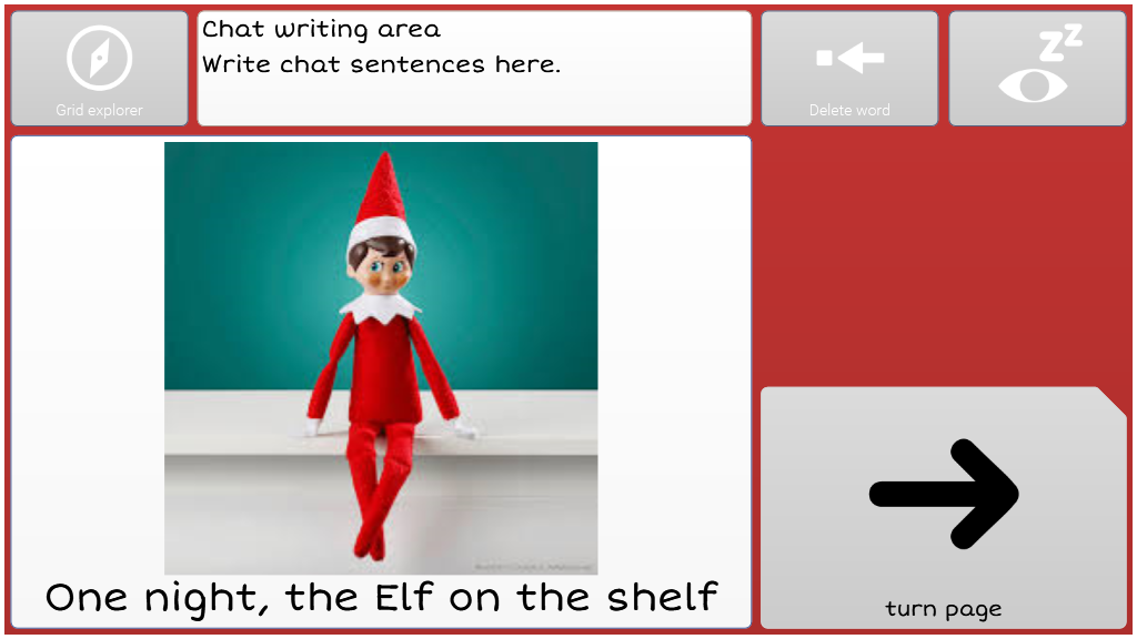 This grid set allows symbol users to create their own Elf on the shelf story. At the end of the gridset, you can choose to write more, print your story, read your story back, or start again.