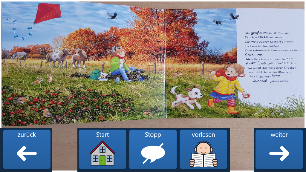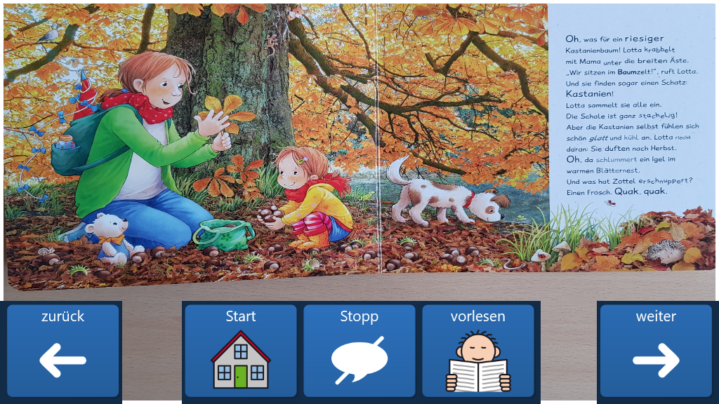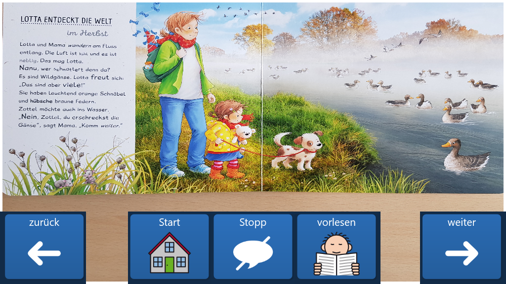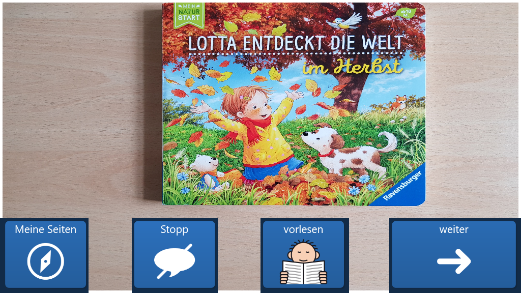 Eine Vorlage für ein einfaches Bilderbuch. Der Text wird beim Öffnen einer Seite automatisch vorgelesen. Das aktuell vorgelesene Wort wird hervorgehoben. Die Vorlage ist für 30 Seiten vorbereitet.