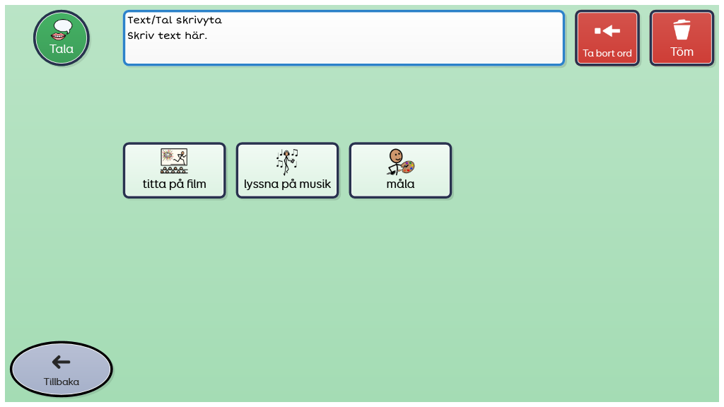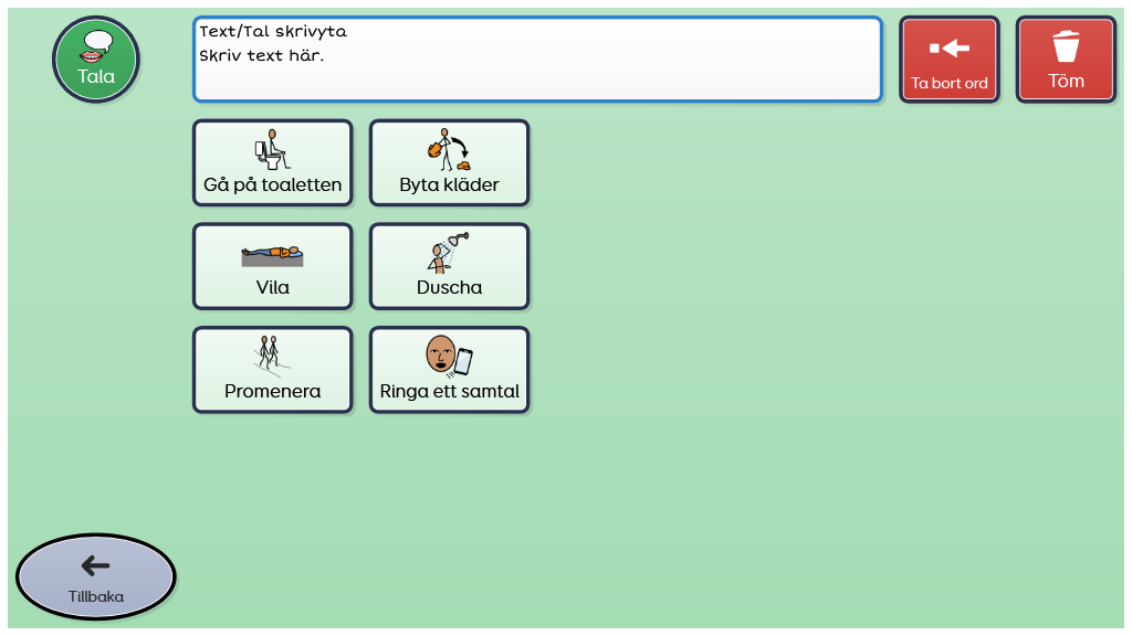 Grundläggande kommunikation från fyra kategorier; känslor, behov, äta & dricka, intressen. Integrerad whiteboardtavla, snabbfraser samt dags- och veckoschema