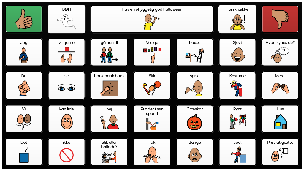Ord når du skal ud og gå slik eller ballede. Du kan nemt printe tavlen ud og tage den med. Hvis du heller vil bruge den på din talecomputer kan du også det. Så skal felterne med tommelfinger op, tommelfinger ned bare have tekst på. Det har de ikke nu, for så kan de bruges til ja, nej, godt eller dårligt alt efter hvad der giver mening og din samtaleåartner kan bruge sine egne tommelfingre hvis det er tydligere for dig. Så nu er det bare afsted ud og skræmme og samle slik. Jeg håber i får det uhyggeligt sjovt.