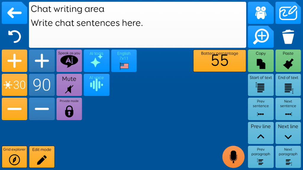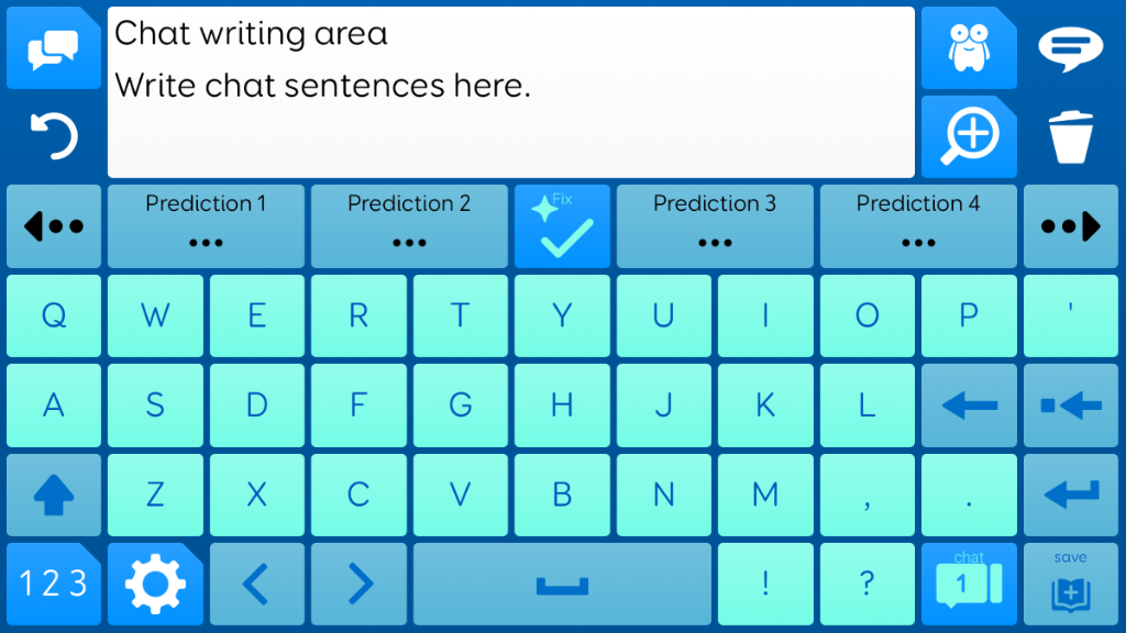 UPDATED! Now includes: -The new "Chat Switcher" function -The "Fix" online AI tool Highly cutomized version of text talker. QWERTY keyboard. Includes: -full screen page (for showing your messages) -whiteboard -custom symoji grids