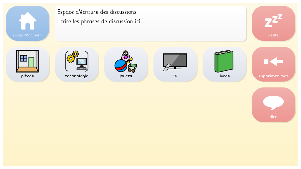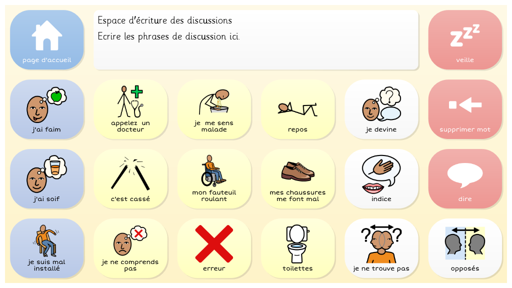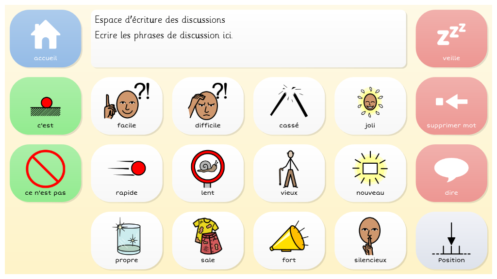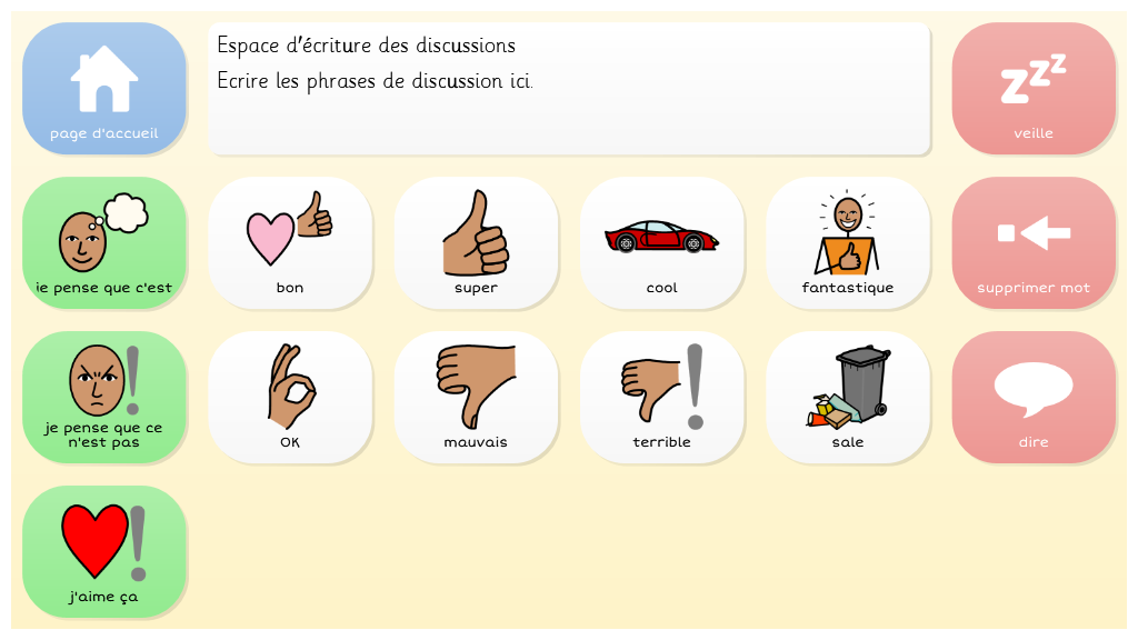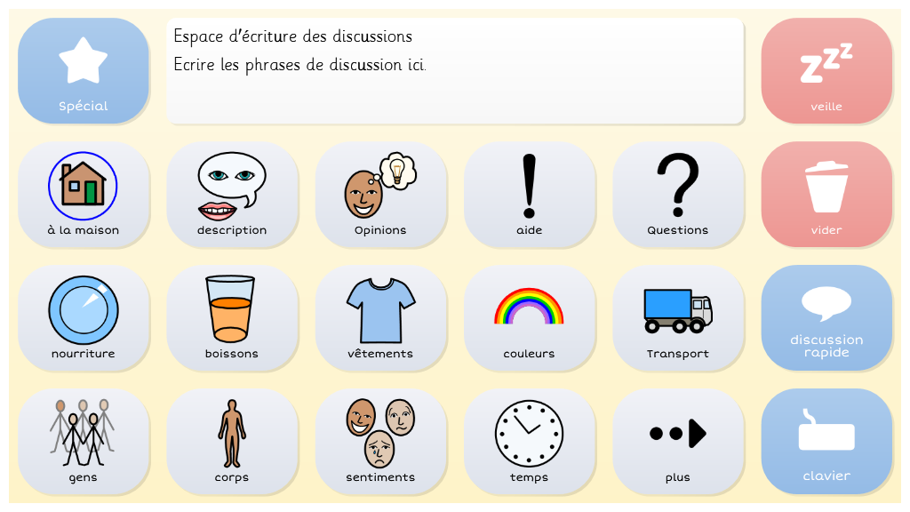 Symbol Talker est un ensemble de vocabulaire complet pour ceux qui souhaitent utiliser des symboles pour parler. Il contient des pages pour le vocabulaire général, ainsi que des pages pour les thèmes de l'école, de la maison et de la thérapie.