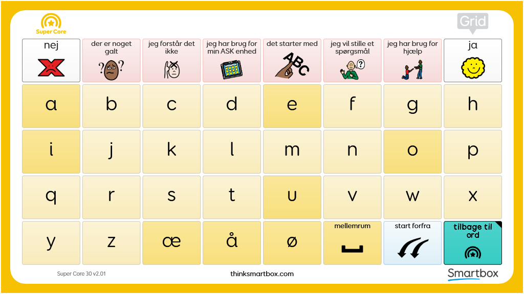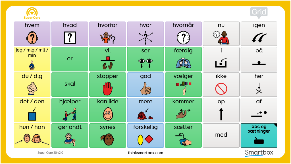 En printvenlig to-sidet kommunikationstavle til brug sammen med Super Core 30 ordforrådet. Består af to sider, den første indeholder ordene fra hjemmeskærmen og med ekstra kerneord til en hurtig og effektiv kommunikation. Den anden side består af bogstaver, tal og nyttige sætninger fra Super Core 30. v2.01