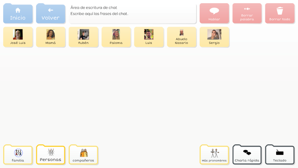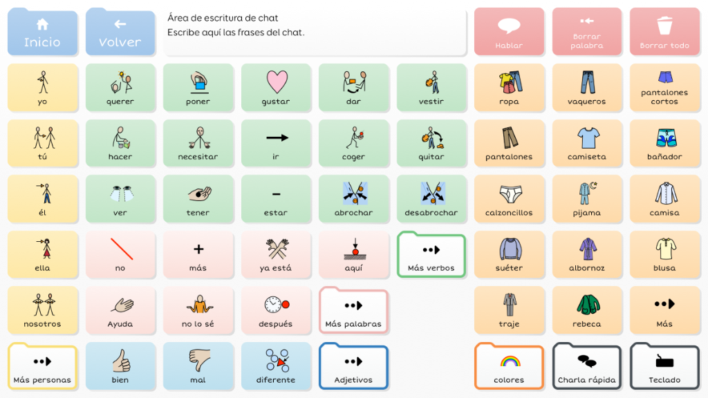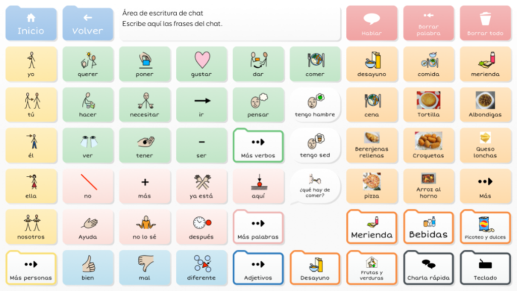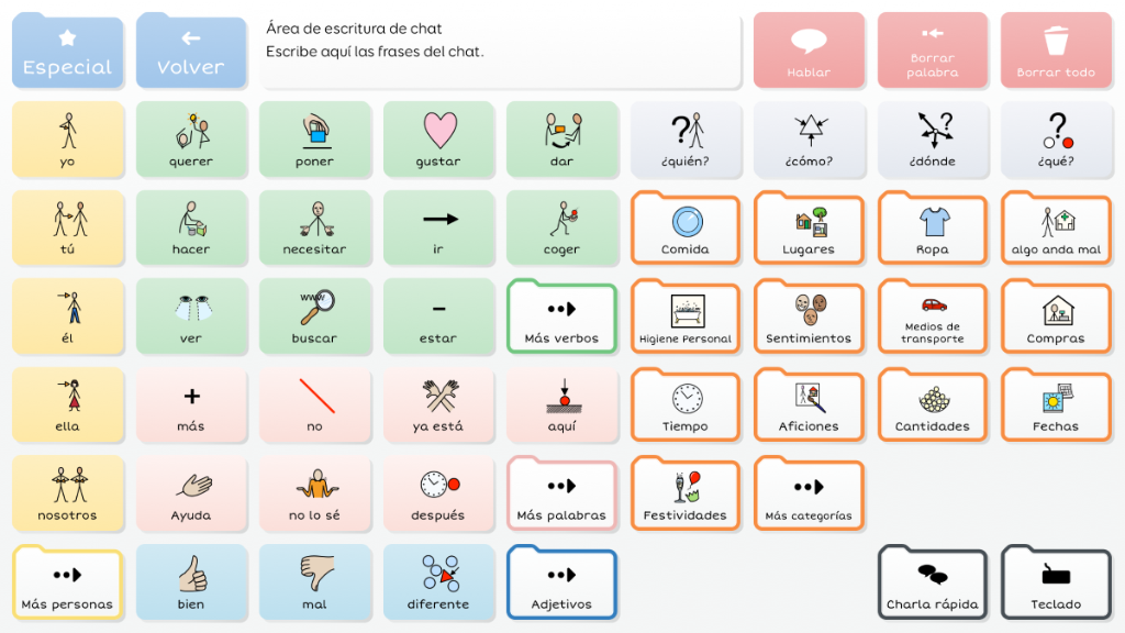 Symbol Talker G divide la pantalla en dos partes: una destinada al vocabulario núcleo y otra al vocabulario periférico. Esto significa que puedes generar frases nuevas de manera rápida y adaptada al contexto. Las herramientas de gramática inteligente de Grid 3 te ayudarán a generar frases gramaticalmente correctas con pocas selecciones. Este gridset es una evolución de BJ Adaptaciones sobre Symbol Talker D y Symbol Talker Núcleo