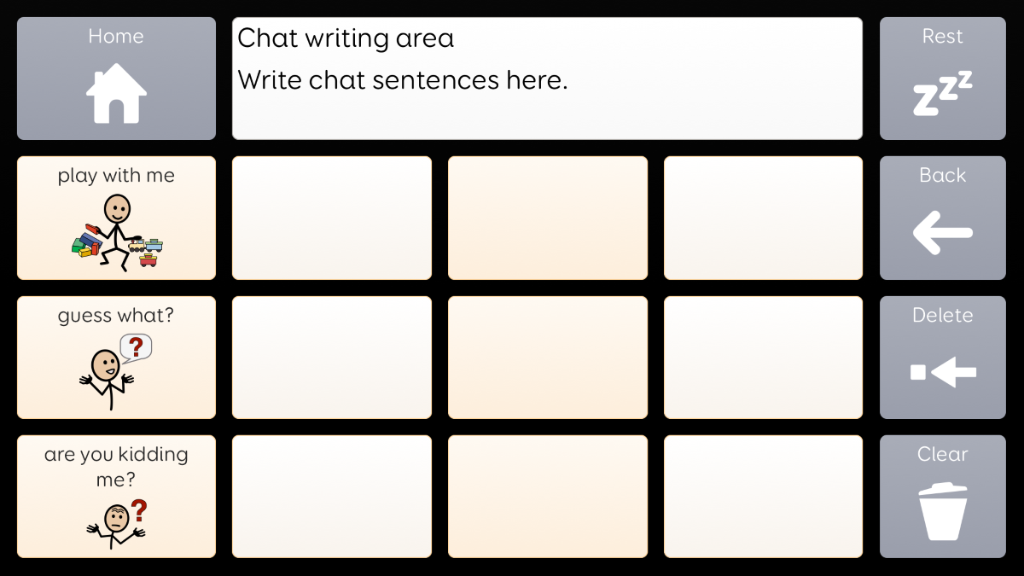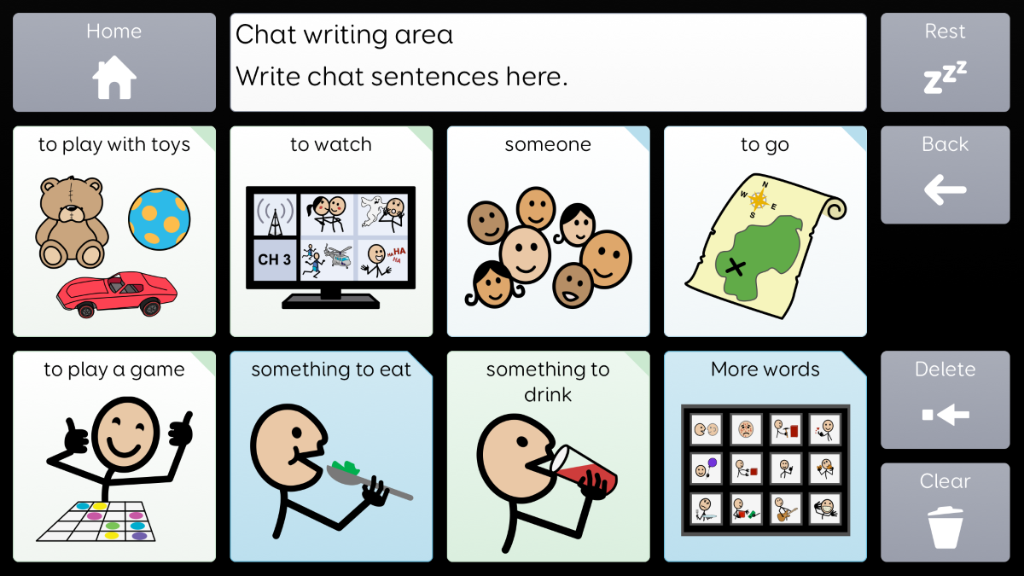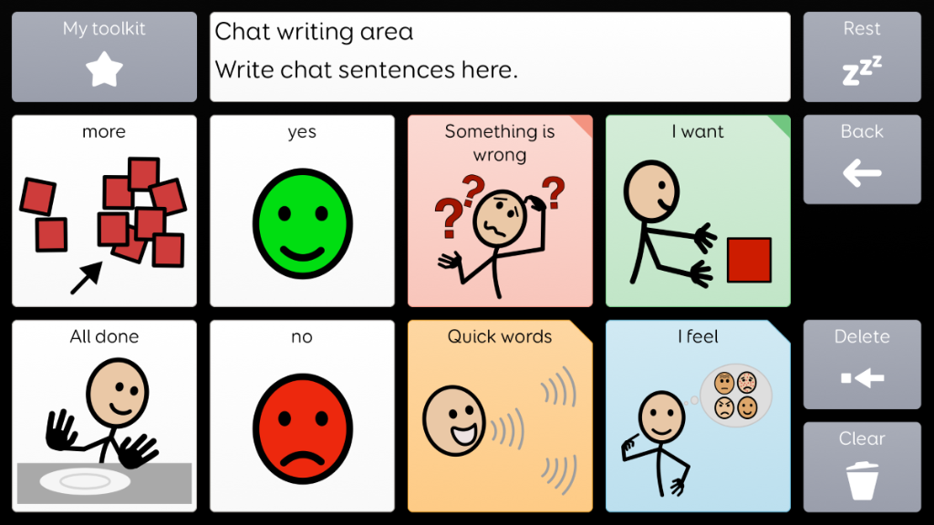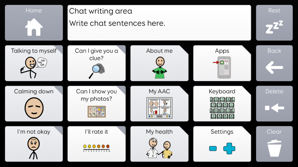 Voco Chat is a low-cell count symbol vocabulary, designed to enable users to communicate for a wide range of reasons. Message pathways, with built-in jumps and carefully selected vocabulary, provide a supported approach to language. The grid set includes resources for supporting communication and emotional wellbeing, with apps such as Symoji and Camera to support interaction and engagement. Voco Chat is suitable for anyone who needs larger cells, and can be used with touch, eye gaze, pointer and switches. Auditory prompts are included for both columns and individual cells. When you add Voco Chat for the first time, you can select either ‘Child’ or ‘Teen and Adult’ in order to choose the most appropriate vocabulary for the user. v1.05