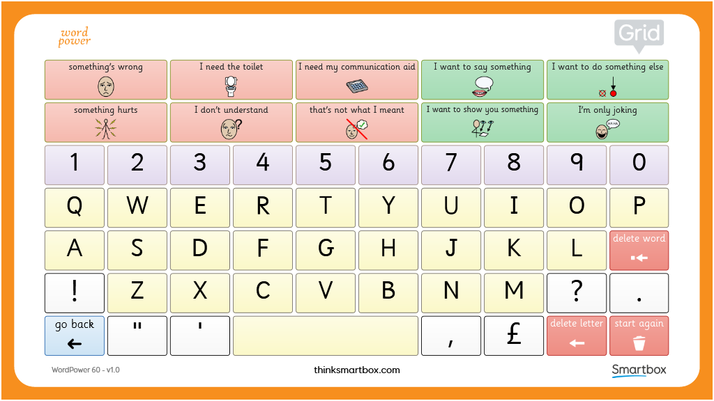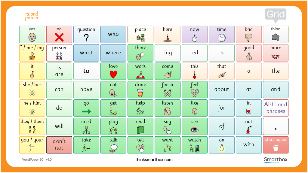 A version of WordPower 60 by Nancy Inman, designed for printing out to act as a low-tech alternative when a communication device is unavailable. Can also be used alongside a communication device for modelling language. Contains two pages - core and spelling/phrases, which could be printed double sided and laminated.
