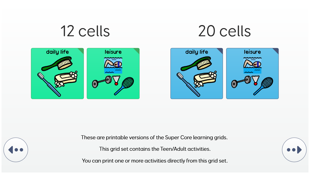 The Super Core Learning grids offer a gentle progression to the full Super Core symbol vocabulary, and an opportunity to build confidence with symbol AAC. They include all of the daily and play activity vocabulary from Super Core, alongside a simplified core vocabulary with a lower cell count of 12 and 20 cells. v2.1
