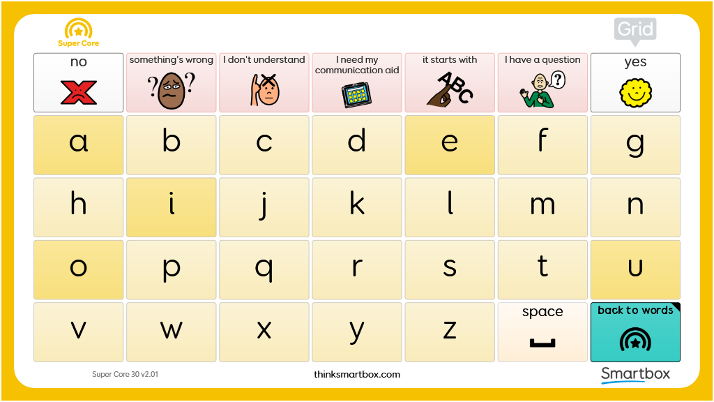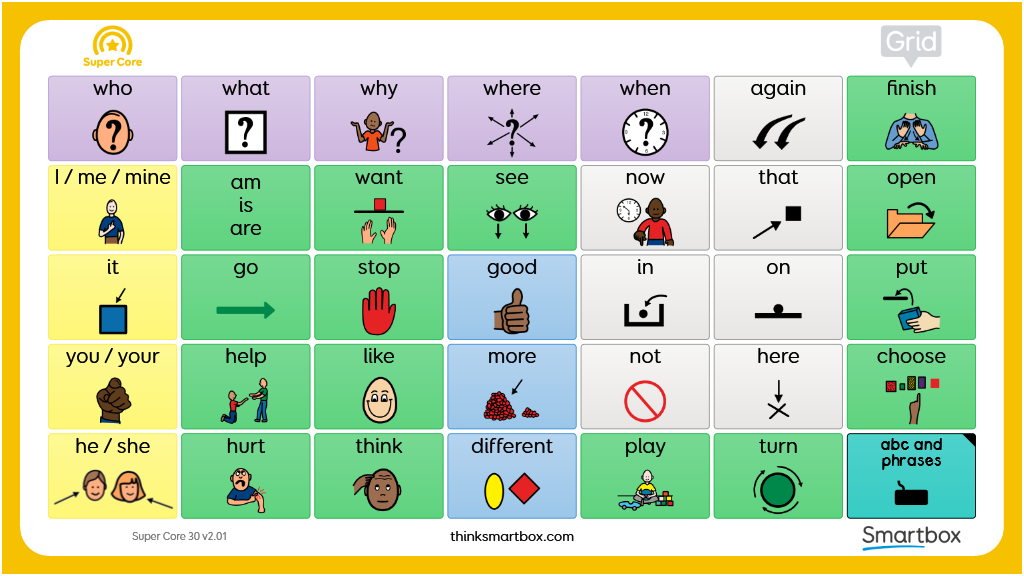 A printable two-sided communication board designed to be used alongside the Super Core 30 vocabulary. Consisting of two grids, the first includes all of the words from the Super Core home grid, plus additional core words, to give access to the most functional and frequently used core words. The second grid consists of letters, numbers, and useful phrases, also taken from Super Core 30. v2.01