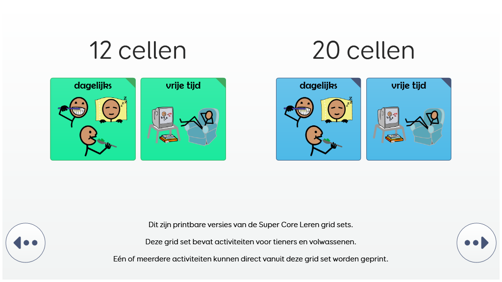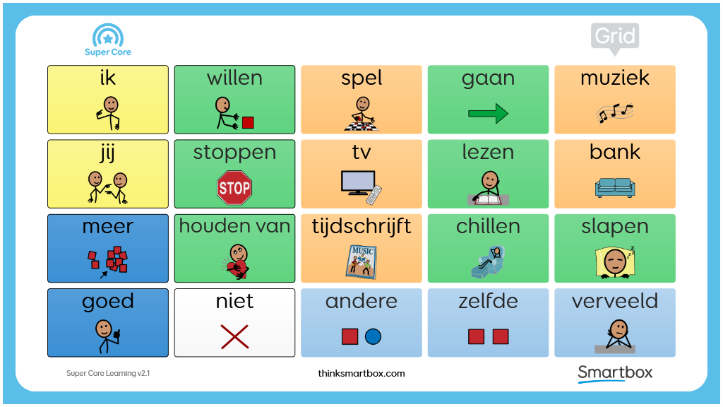 De SuperCore LeerGrids bieden een progressie naar de volledige SuperCore vocabulaire, en bieden een kans om het zelfvertrouwen bij het gebruik van OC op te bouwen. De LeerGrids bevatten alle dagelijkse, speel- en ontspanningsactiviteiten vocabulaire van SuperCore. Daarnaast bevat het een versimpelde kernvocabulaire met 12 of 20 cellen. v2.1