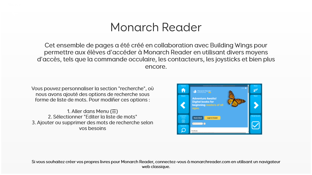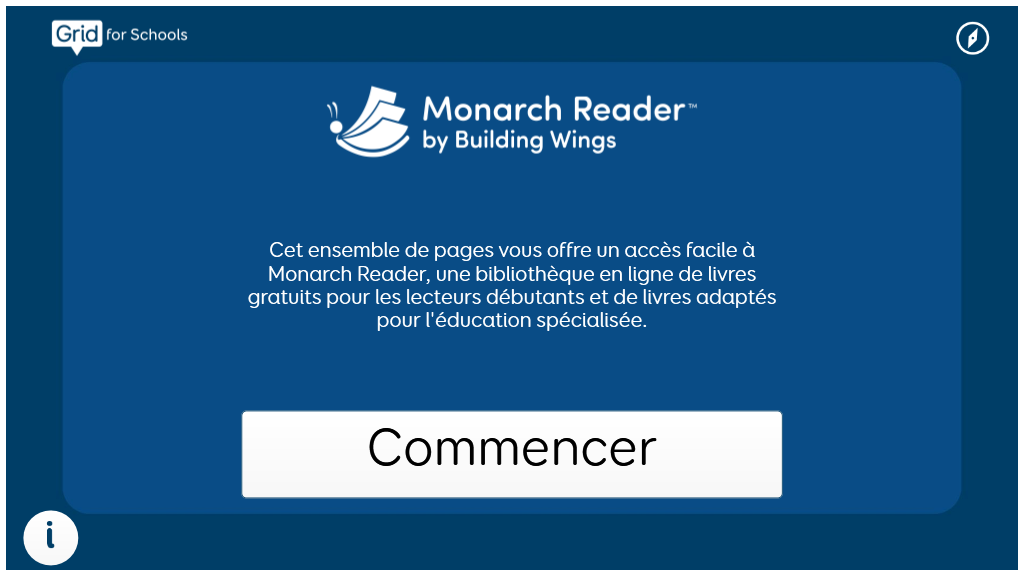 Monarch Reader par Building Wings est une bibliothèque en ligne de livres gratuits pour les lecteurs débutants de tous âges et de livres adaptés pour l'enseignement spécialisé. v1.02