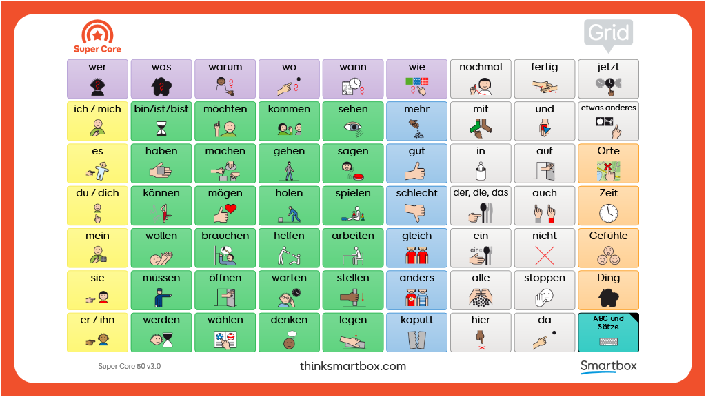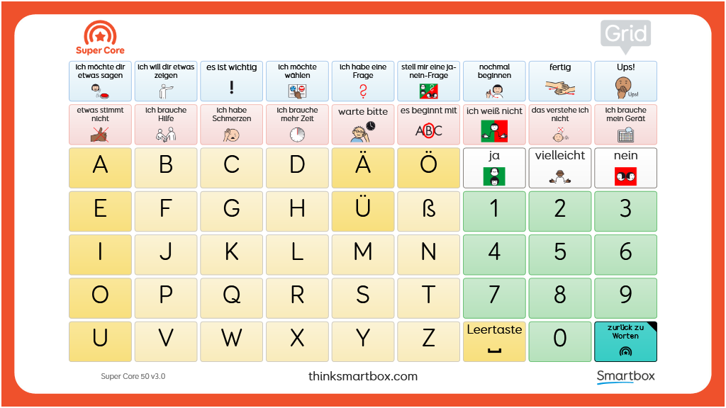 Eine ausdruckbare zweiseitige Kommunikationstafel, die in Kombination mit dem Super Core 50 Vokabular verwendet werden kann. Eine Seite dieser Kommunikationstafel zeigt alle Wörter der Super Core 50 Startseite, sowie zusätzliche Kernwörter. So wird ein Zugang zu den funktionalsten und am häufigsten verwendeten Kernwörtern ermöglicht. Auf der zweiten Seite befinden sich Buchstaben, Zahlen und nützlichen Redewendungen, die ebenfalls aus Super Core 50 stammen. v3.0