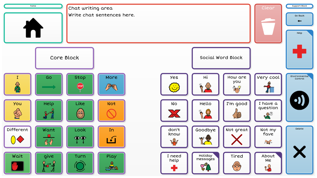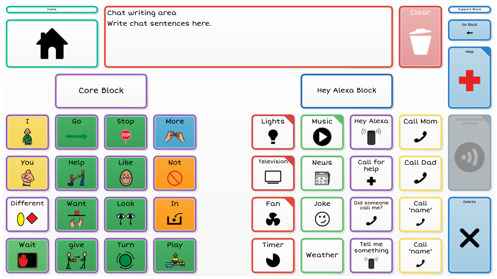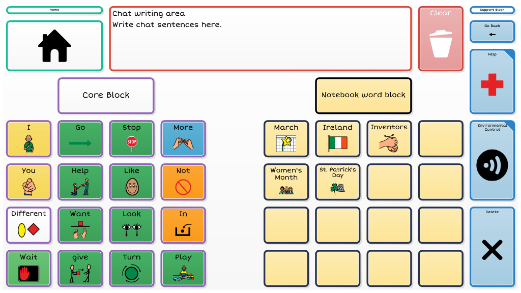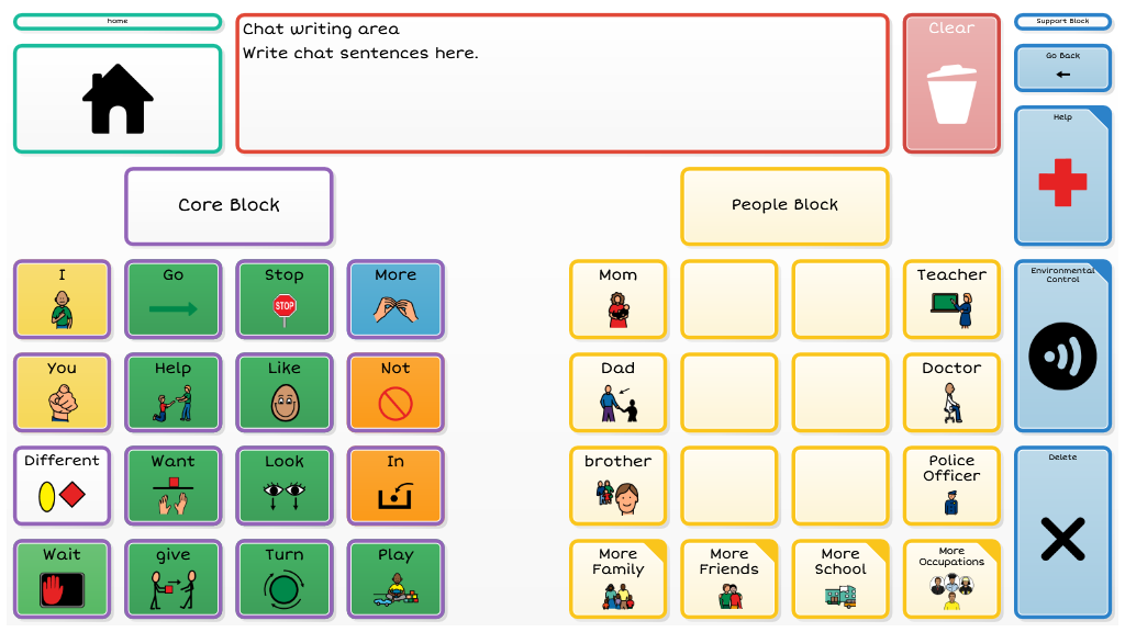 Level 3 introduces more independent access to a robust vocabulary by making scanning available to all four columns within a block. Dynamic navigation throughout the page set continues as the available vocabulary increases. To navigate to alternate vocabulary within the 4th and 5th block requires cells to be activated by touch.