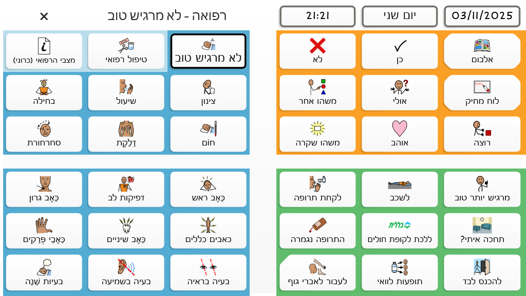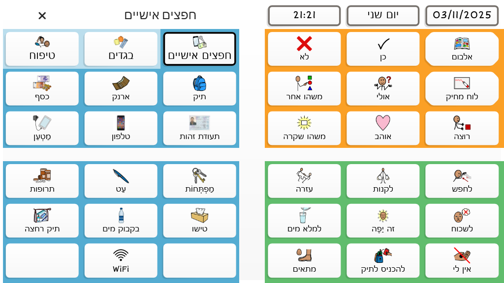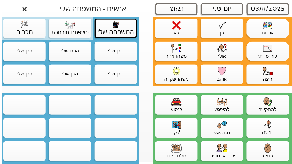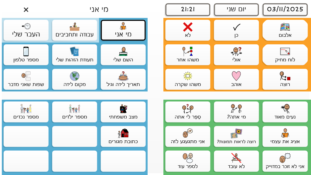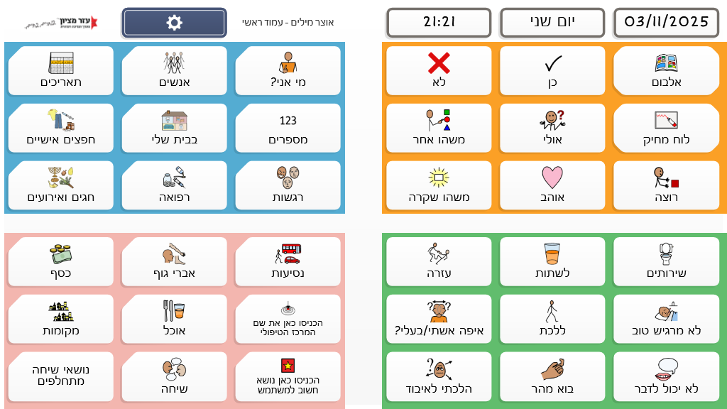 לוח גנרי לשיחה מורחבת עם אנשים עם אפזיה בשלב השיקומי והכרוני. הלוח מסודר קטגוריאלית בשילוב עם פעלים ואמירות מתאימות לכול נושא. פותח על ידי מירב רווה מלכה וידידה לוין שטרנברג מצוות אומר עזר מציון