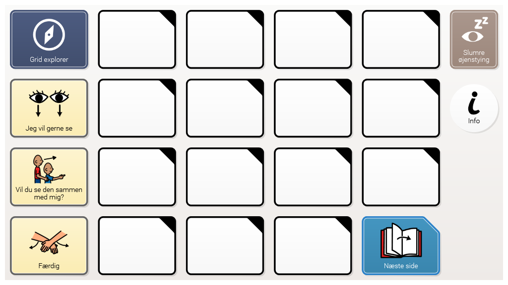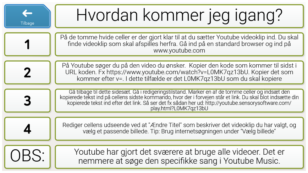 OBS: Youtube har gjort det lidt sværere at finde videoer der kan bruges. Det er nemmest at søge videoerne i Youtube Music. I Grid findes der et integreret sidesæt til Youtube brugerne. Til dem som har behov for et mere simpelt udtryk, så kan denne skabelon bruges til at personliggøre et sidesæt med direkte adgang til Youtube videoerne. Se vejledningen i Grid Layoutet under "info". Dette Grid Layout virker kun med forbindelse til wi-fi forbindelse. V. 5.0